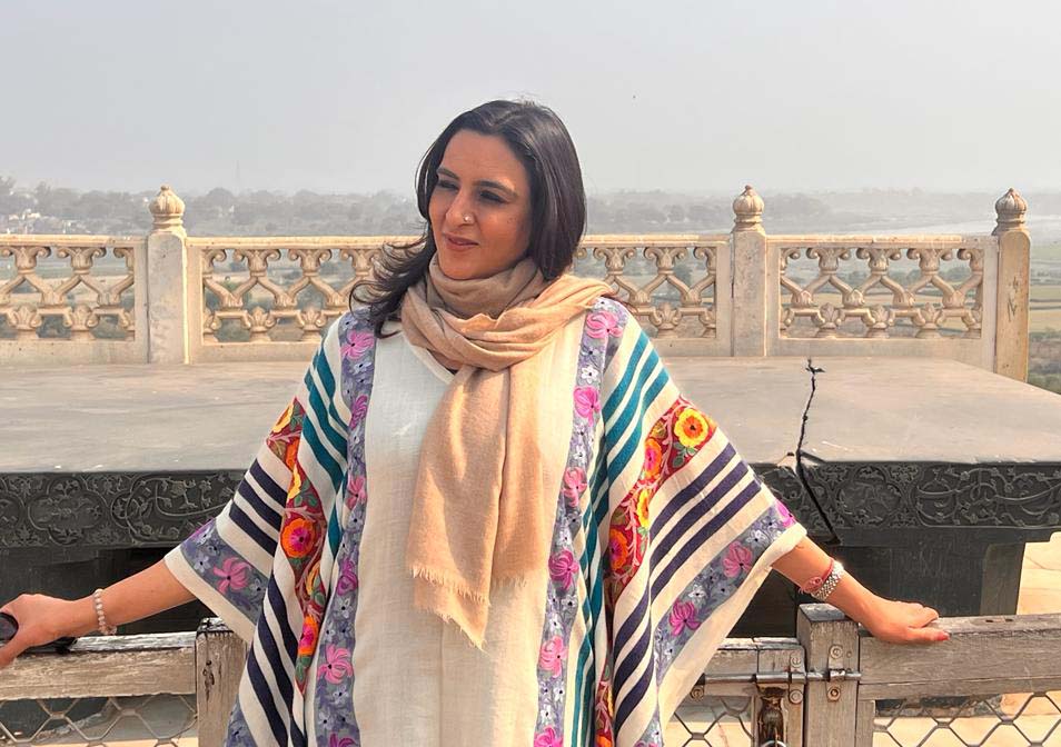 Nagina Bains, a well-known writer, Testler Director, CII IWN Chairperson and columnist for Indian Express, wearing an Albasir Designer Cape. This cape is handcrafted by the designer of Albasir Industries Pvt. Ltd., She is in a Pashmina Kalamkari cape with embroidered floral stripes in Ari work. It is embellished in contrasting colours by the traditional ari work of Kashmir.