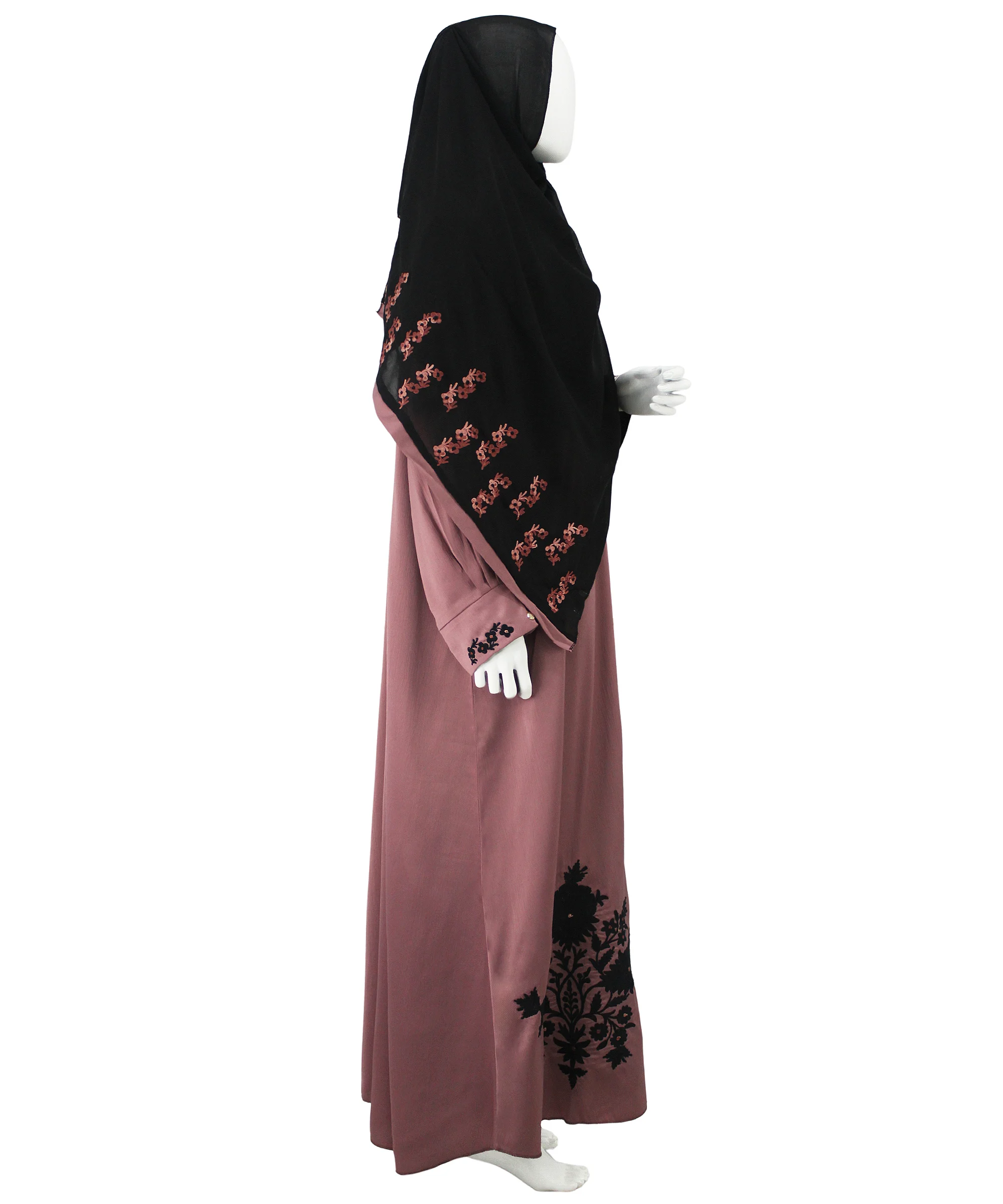 • A Rich Mauve Color Abaya Pairs Elegantly With Black Hijab.