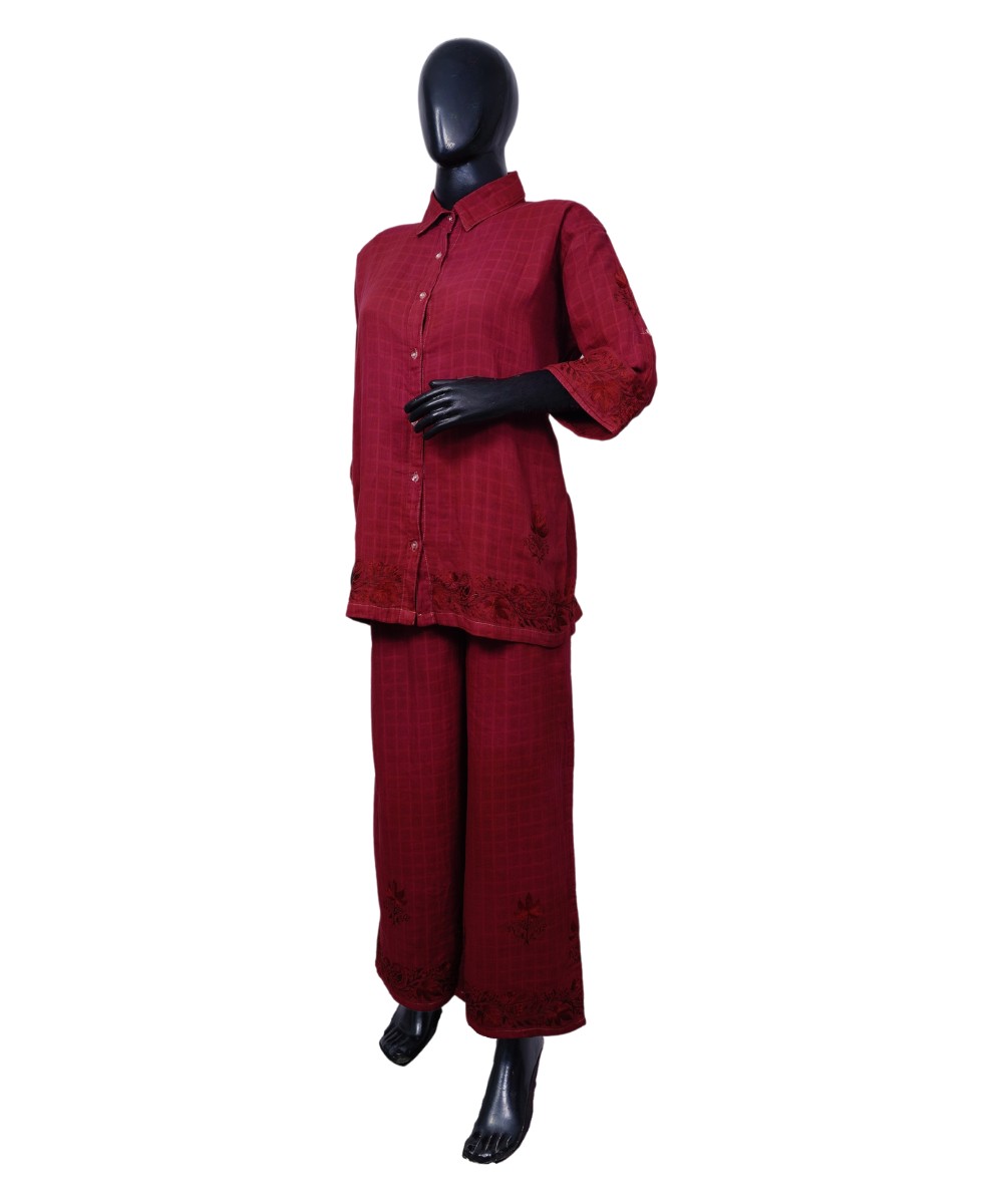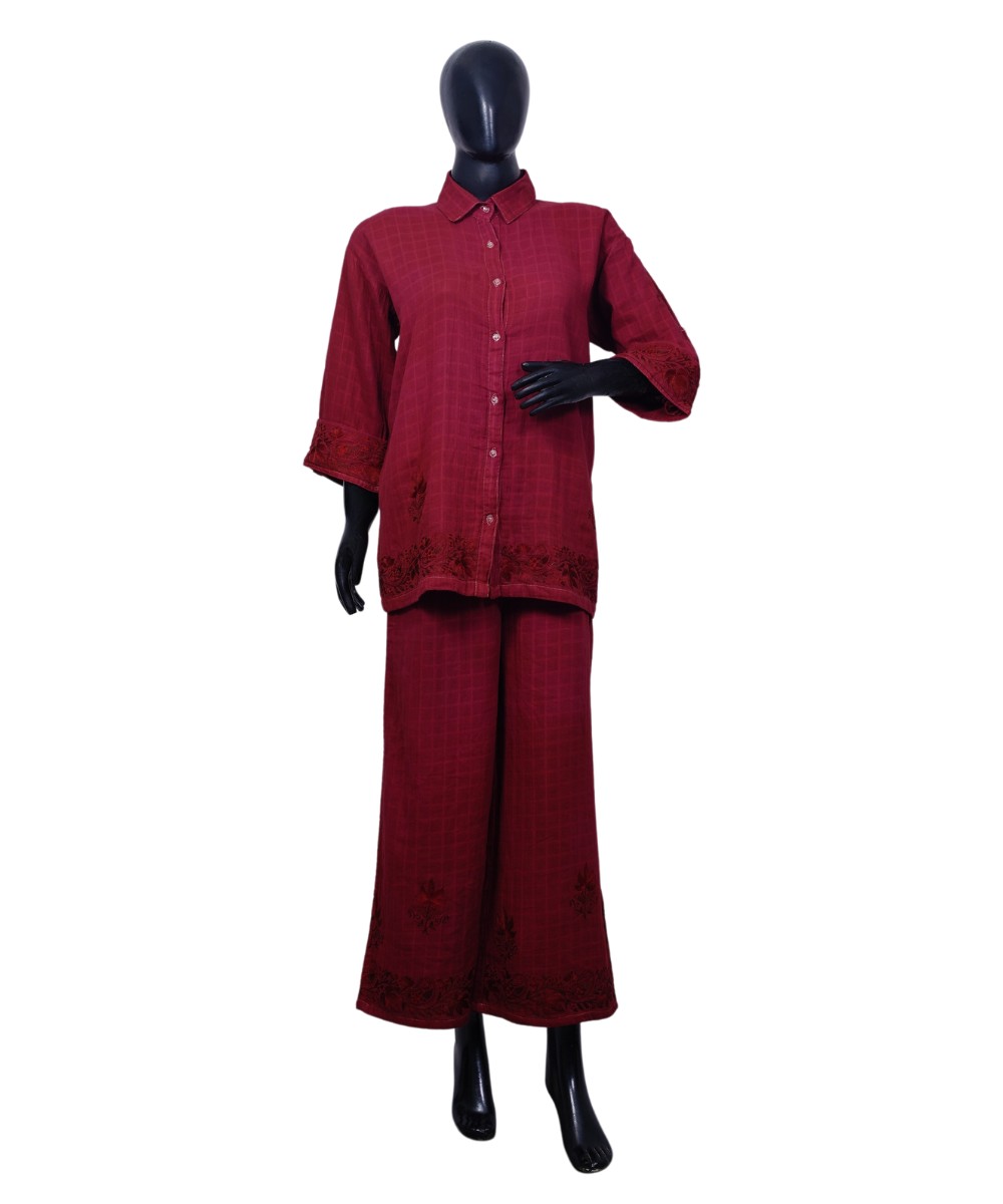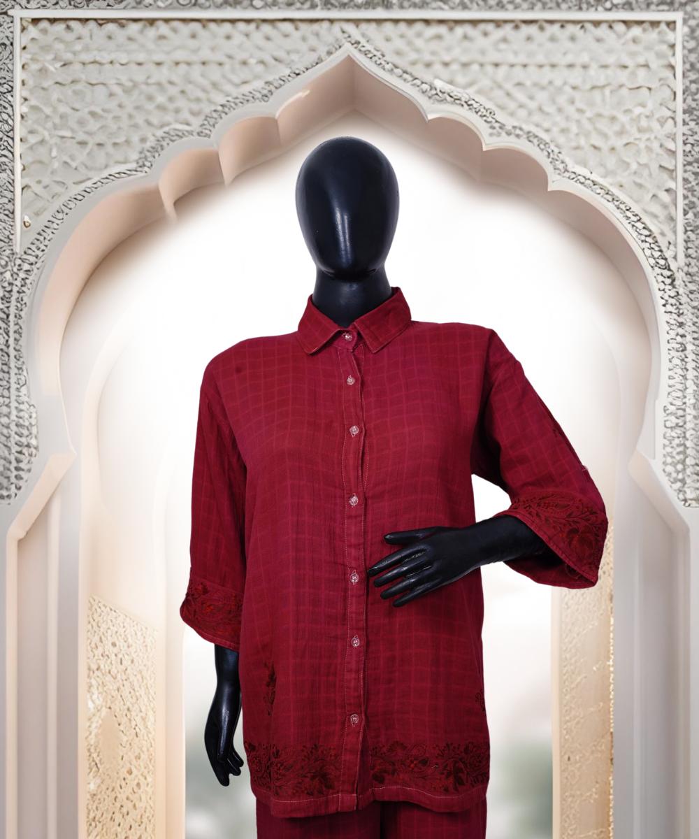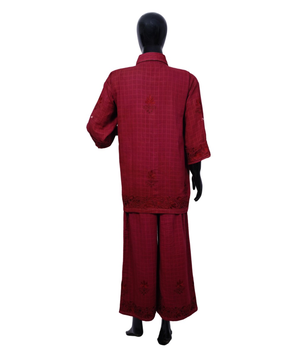 Step into timeless sophistication with our Deep Maroon Elegance 2-Piece Co-Ord Set, designed to make a lasting impression. This stunning ensemble is adorned with delicate Aari work, skillfully crafted by our master artisan, showcasing the rich heritage of Kashmiri craftsmanship. The set is further elevated with elegant border and motif designs, adding a refined and stylish touch to the overall look. Crafted from premium cotton fabric, it offers unmatched comfort without compromising on style—perfect for both festive occasions and everyday elegance.