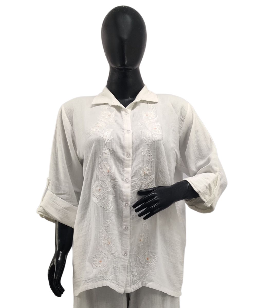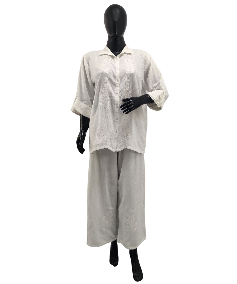 Wrap yourself in timeless charm with this dazzling 2-piece co-ord set in a classic white hue, designed to exude effortless grace and elegance. Gracefully detailed with intricate Aari embroidery, it offers a beautifully handcrafted finish that reflects the richness of traditional artistry. The set is further elevated by refined designer detailing, adding a signature touch of sophistication to the overall look. Crafted from premium quality cotton, it ensures unmatched comfort and breathability, making it an ideal choice for both special occasions and chic everyday wear.