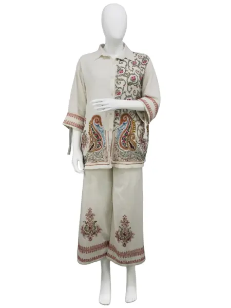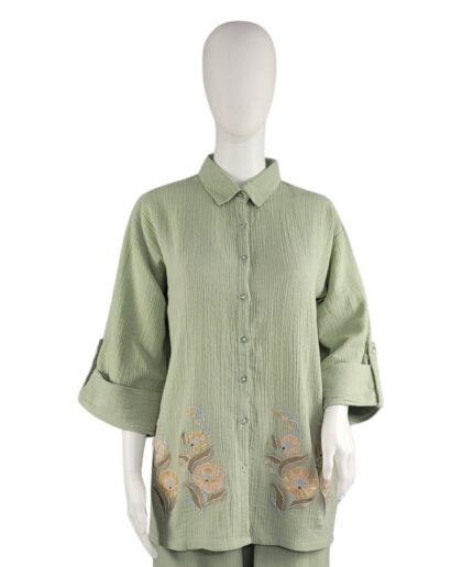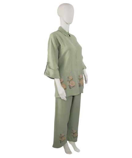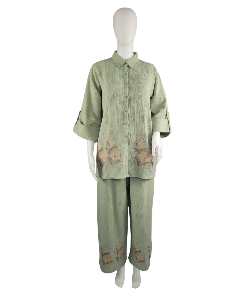 Refresh your wardrobe with this chic 2-piece co-ord set in a light green hue, perfect for a fresh and elegant look. Adorned with intricate Aari work on both the front and back of the top, it brings a touch of contemporary flair while honoring traditional craftsmanship. The beautifully showcased motif designs add an artistic depth, blending heritage art with modern aesthetics. Crafted from premium quality cotton khadi fabric, this set offers breathable comfort and refined style—making it an ideal choice for both everyday elegance and special occasions.