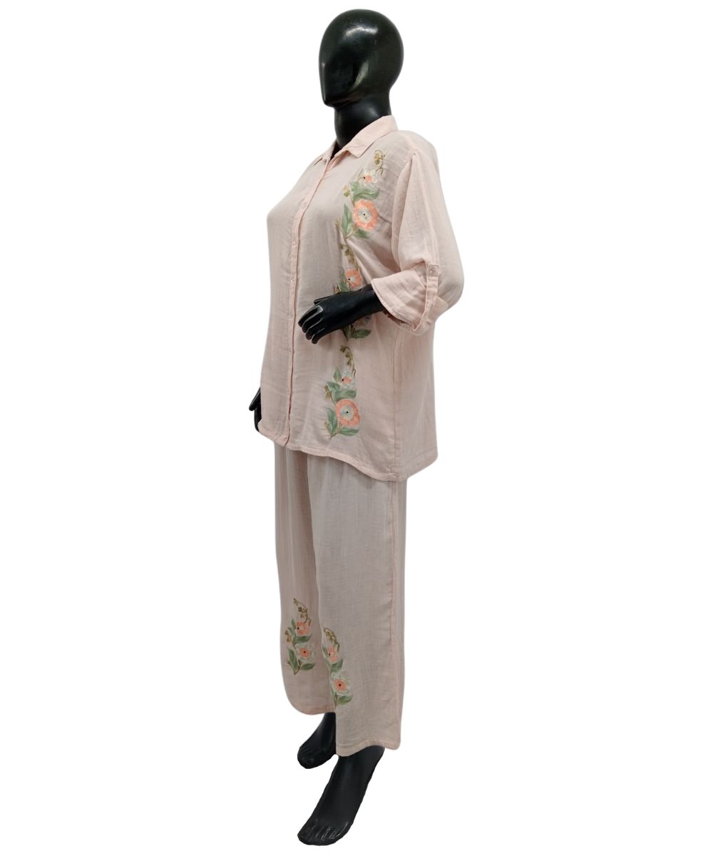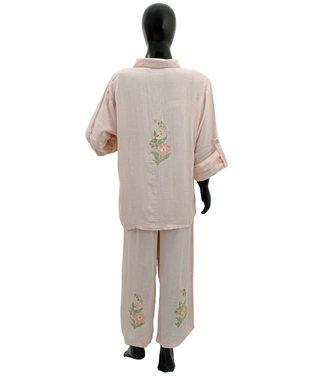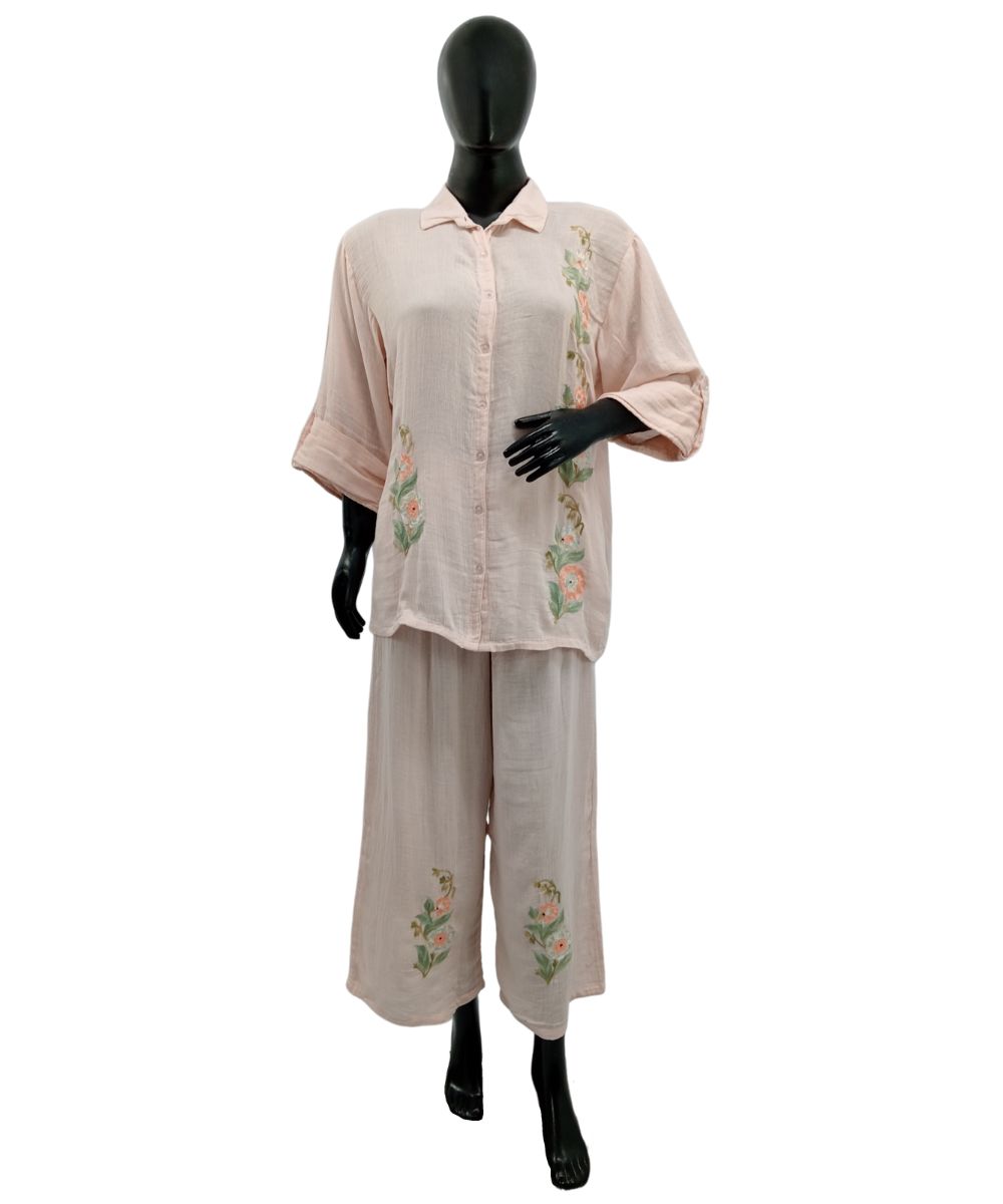 Elevate your wardrobe with this alluring 2-piece co-ord set in a soft and graceful peach hue, crafted to deliver the perfect blend of style and comfort. Embellished with beautiful Aari work, it adds a refined and elegant touch that showcases timeless craftsmanship. Created from premium quality cotton fabric, this ensemble is not only stylish but also exceptionally breathable. Designed to keep you cool and comfortable all day long, it’s the ideal choice for warm-weather occasions, festive gatherings, or effortless everyday wear.