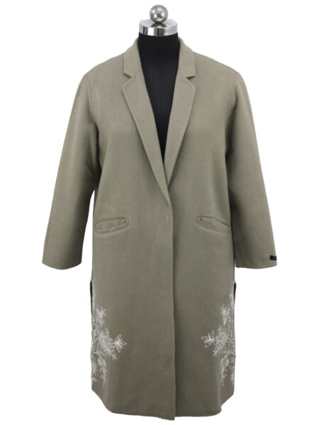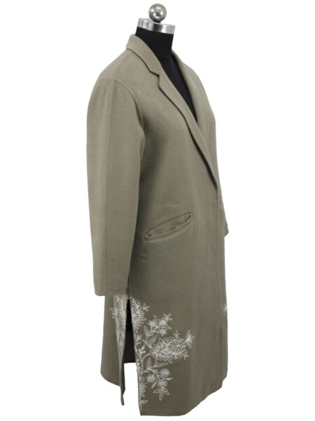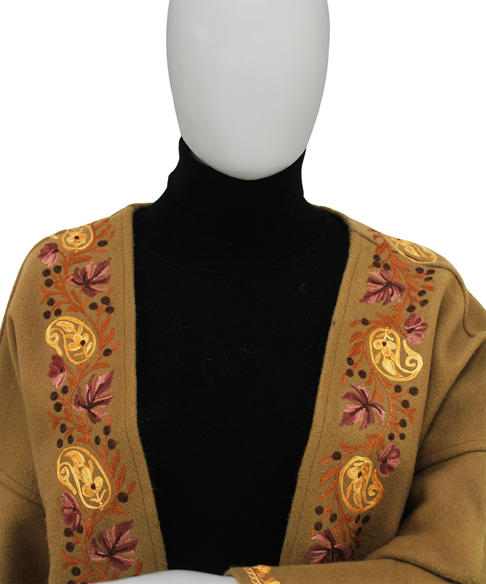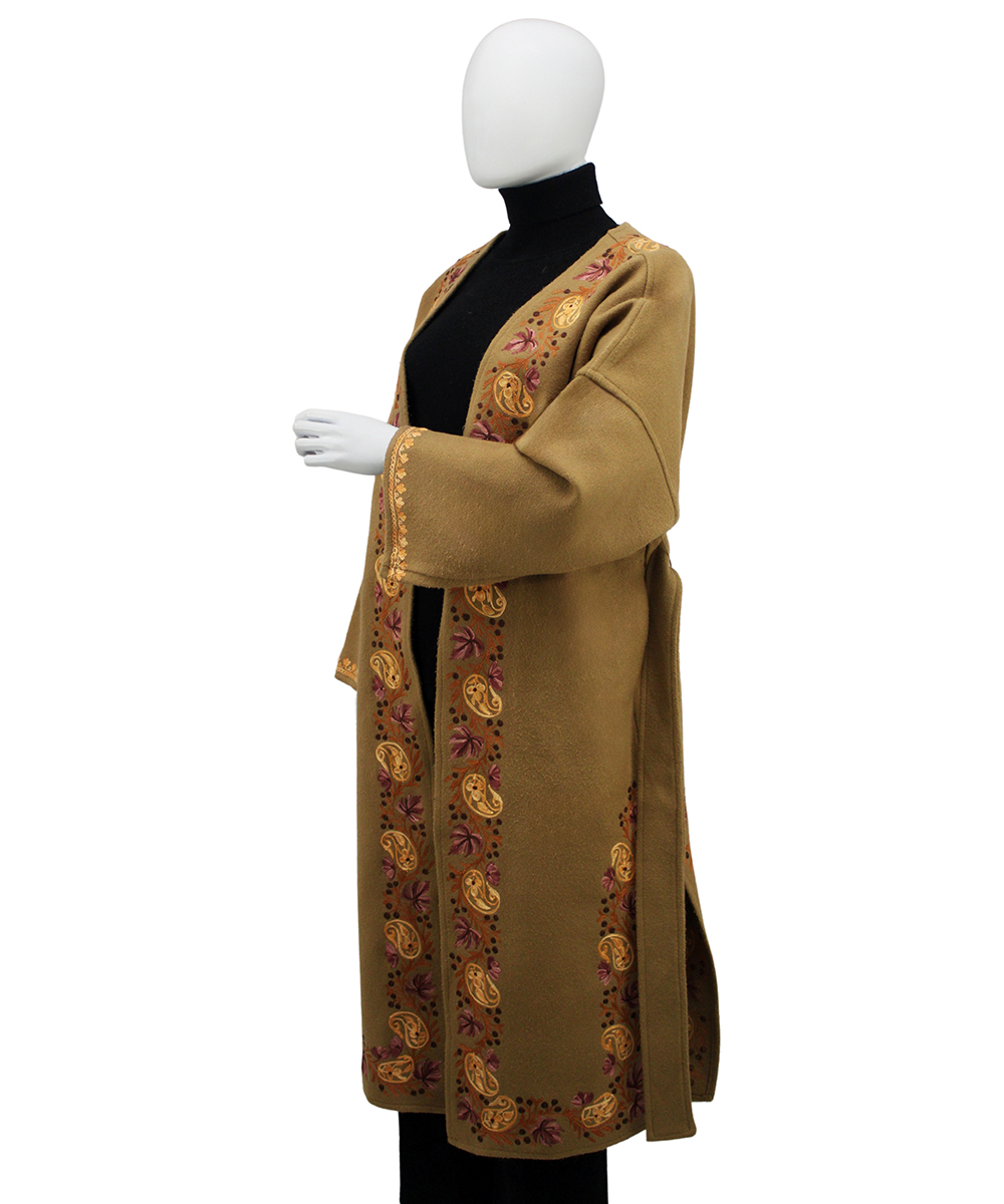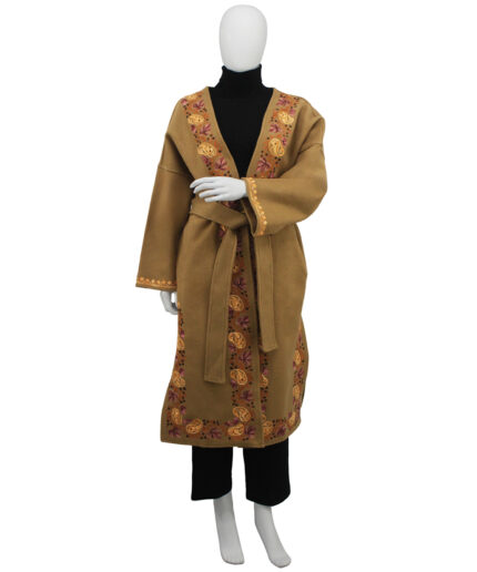 Step into timeless elegance with the Albasir Coat Aari Wool, a long coat in a soft beige hue that brings grace and versatility to your winter wardrobe. The coat features intricate Aari embroidery in a refined border design across both the front and back, showcasing traditional craftsmanship with modern appeal. The neutral tone adds understated sophistication, making it easy to style for both formal and casual occasions. Crafted from luxurious powerloom wool fabric, it ensures lasting warmth, comfort, and durability throughout the colder months. Designed for the style-conscious individual, this coat combines cultural artistry with everyday functionality. Stay stylish with this stunning winter coat — a perfect fusion of elegance, comfort, and timeless design.