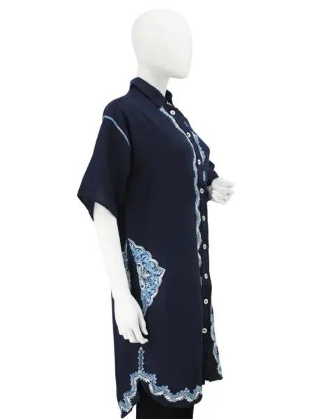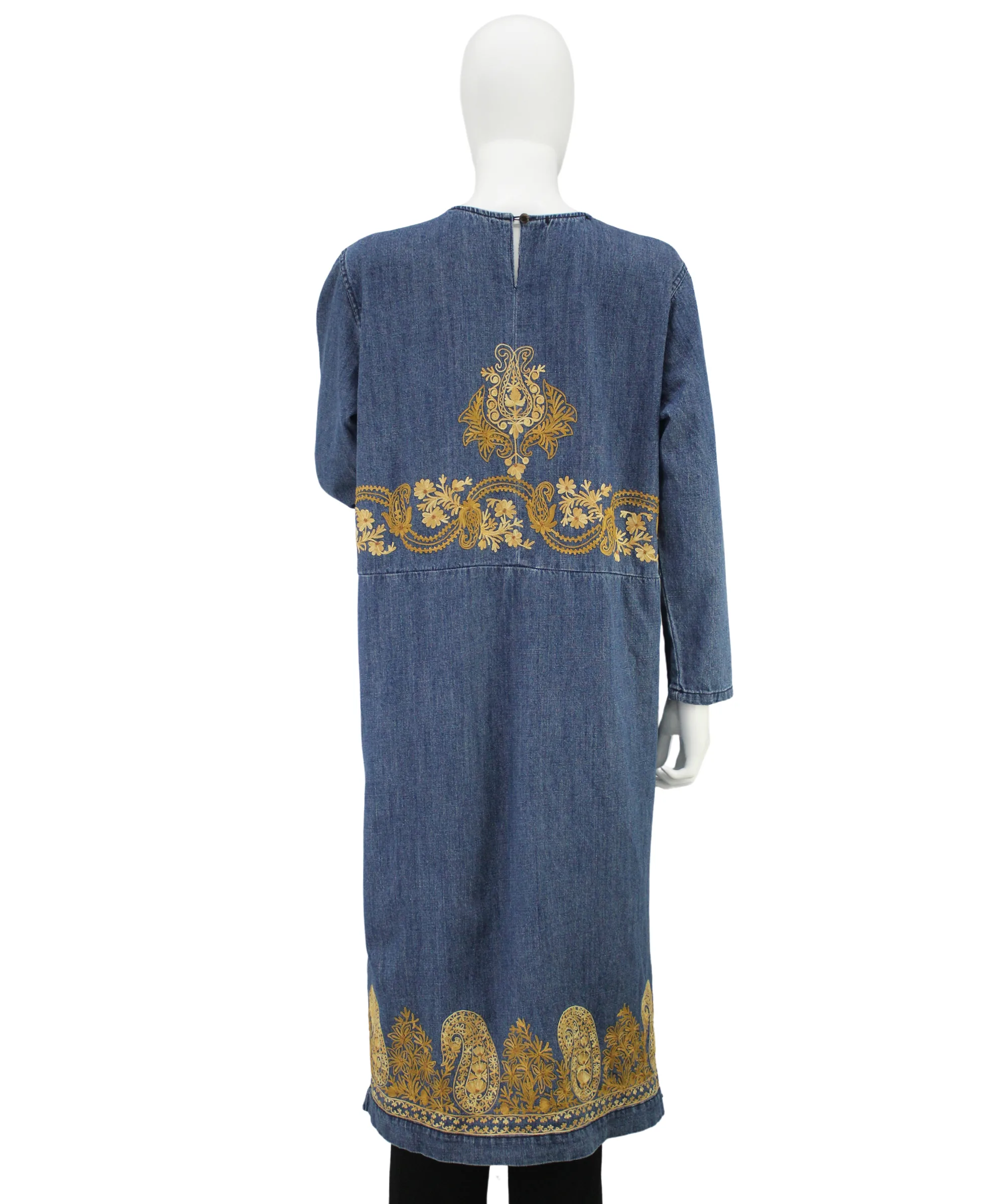 This stunning long blue dress exudes grace and sophistication, making it a timeless addition to any wardrobe. Crafted from premium quality denim, it combines enduring style with exceptional durability, perfect for both special occasions and everyday elegance. The dress is beautifully embellished with delicate Aari embroidery, adding intricate artistic detail and a touch of cultural richness that elevates its overall appeal. A subtle designer touch gracefully enhances its luxurious feel, creating a harmonious blend of tradition and modernity. This dress is the perfect choice for those seeking a refined and elegant look that lasts.