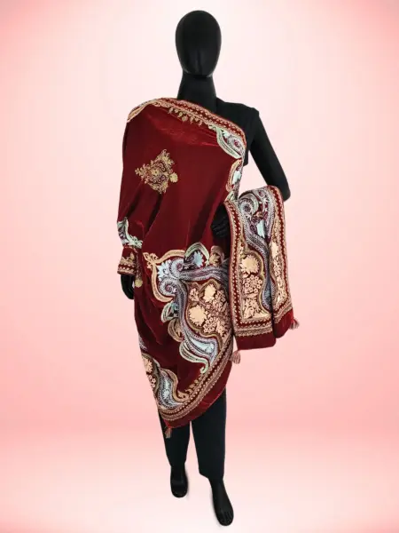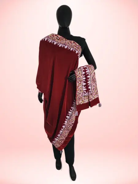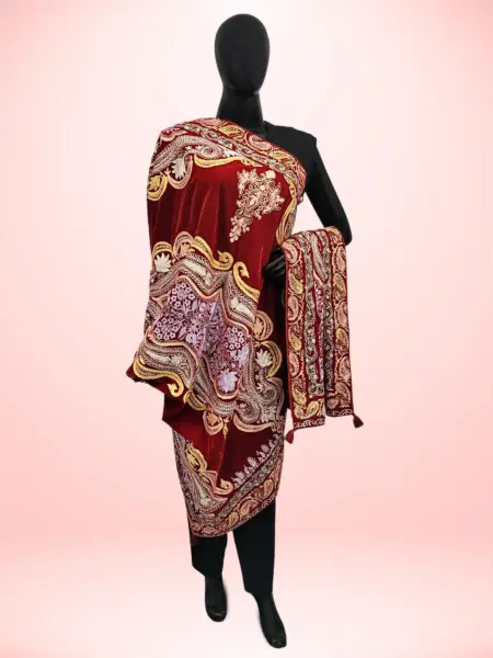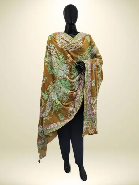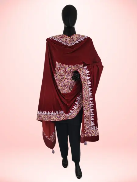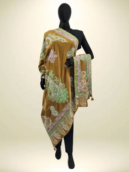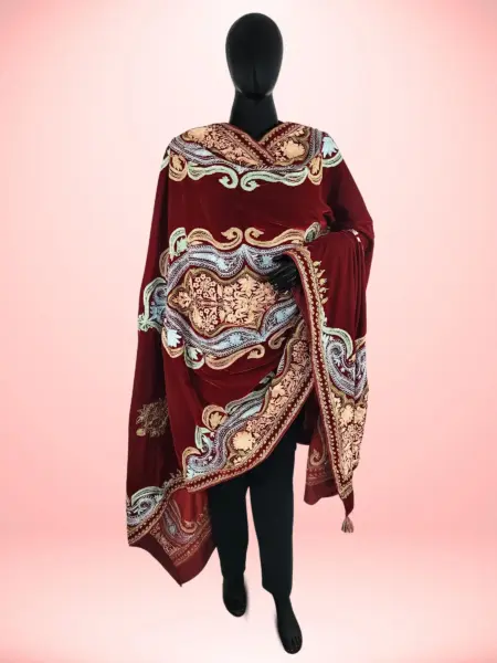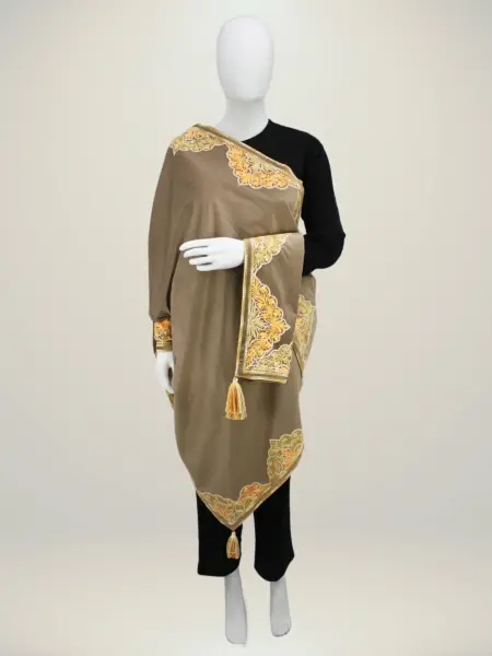 Made from soft georgette, this dupatta offers a light and elegant drape that complements any ensemble with effortless grace. Adorned with intricate Aari work, it beautifully highlights traditional artistry and craftsmanship. Featuring a classic Jamawar-inspired design, it exudes a timeless look that never goes out of style. The vibrant ferozi shade adds a refreshing burst of color, bringing charm and vitality to any outfit, making it a perfect accessory for both casual and festive occasions.