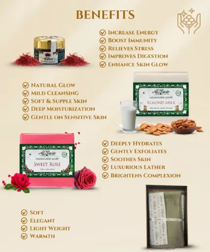Celebrate every occasion with the richness of Kashmir through our exclusive Festive Gift Hamper, thoughtfully curated to blend wellness, tradition, and luxury. This elegant hamper includes Almond Milk Handmade Soap & Rose Soap Handmade , Pure Kashmiri Saffron, and a beautifully crafted Shawl, offering an authentic touch of Kashmiri heritage. Perfect for those who appreciate the finest, it combines soothing fragrances and artisanal craftsmanship to create a memorable and heartfelt gift.