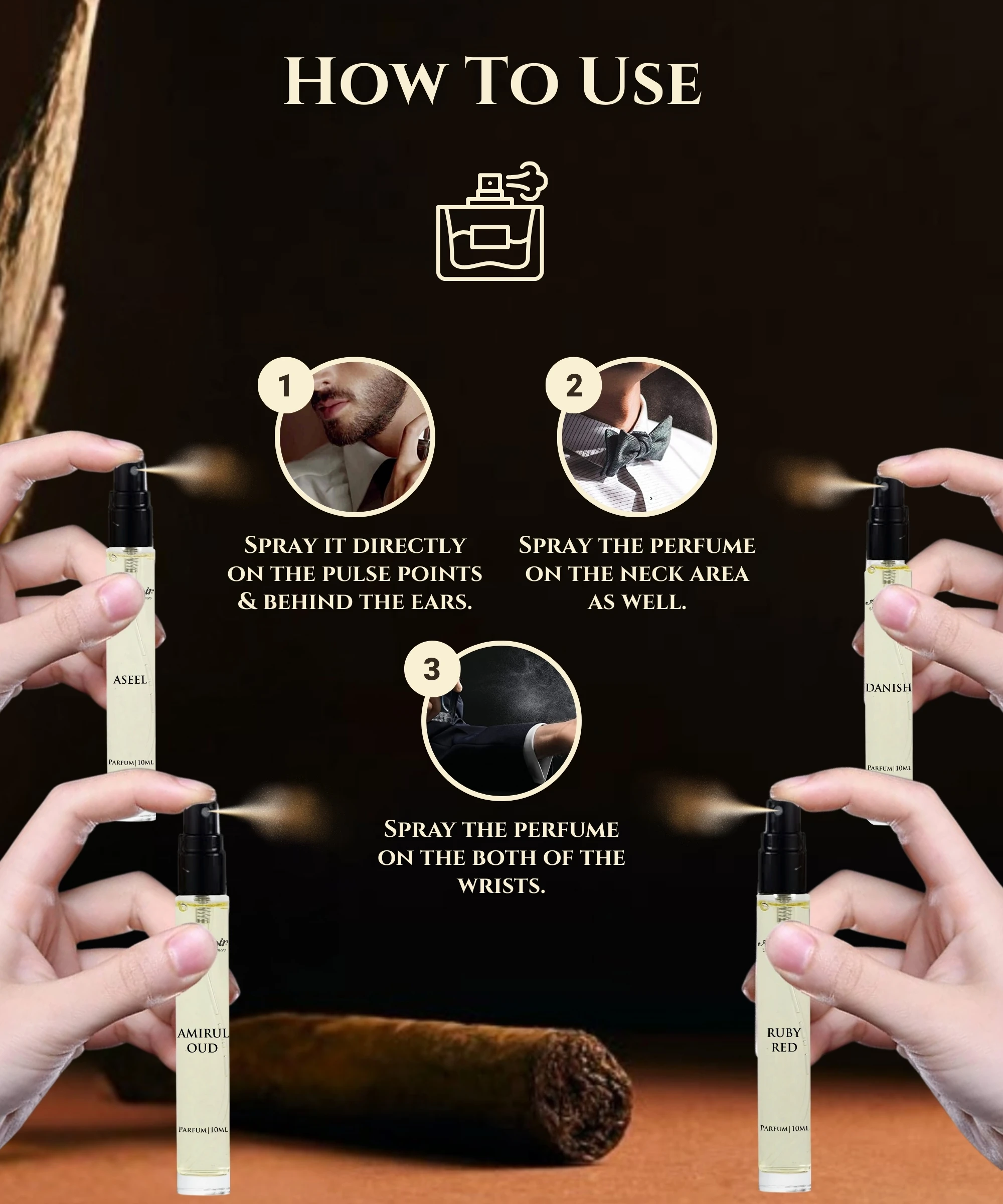 Apply to Pulse Points Dab on wrists, neck, behind ears, and inner elbows for a long-lasting scent.