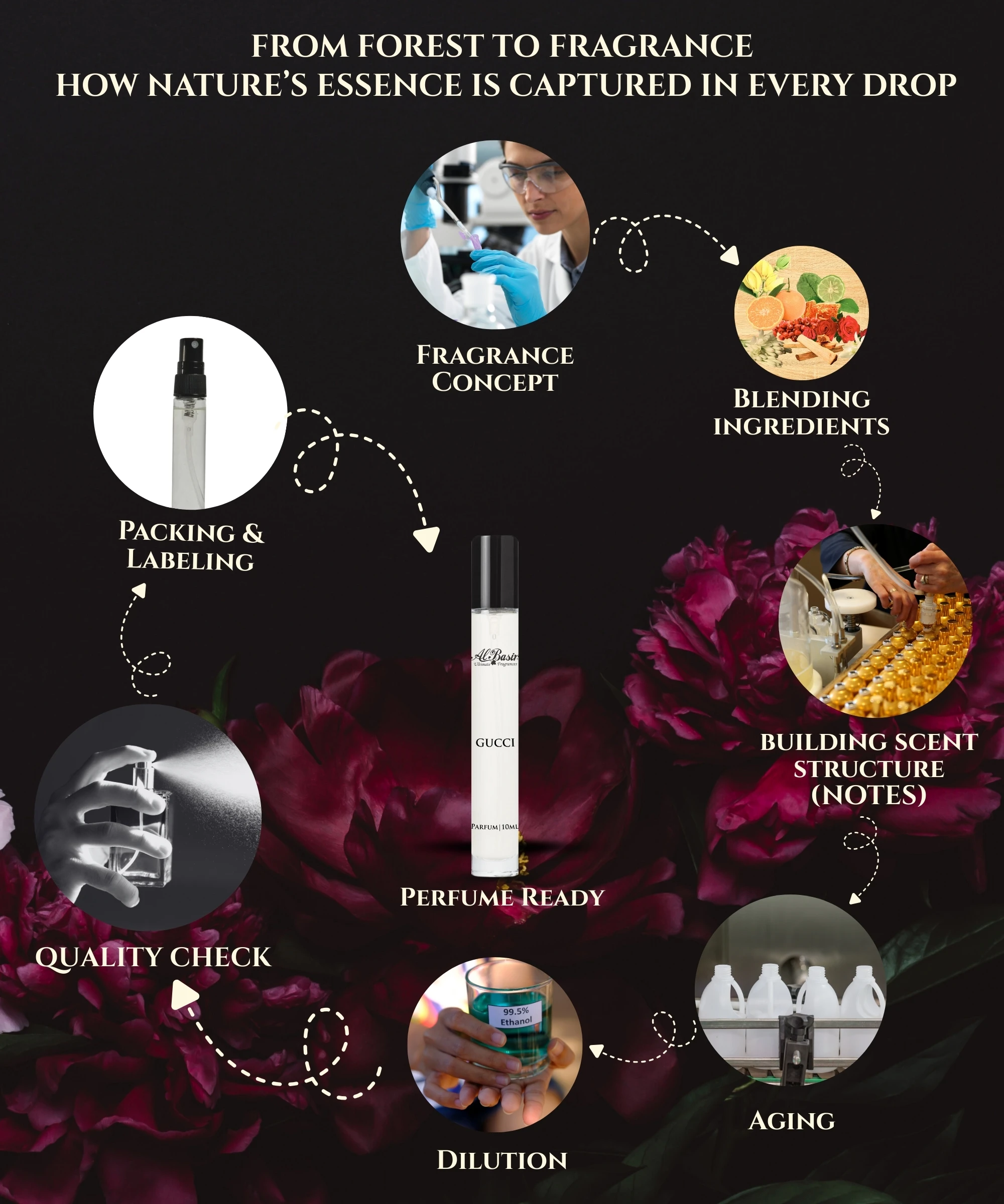 After blending, the perfume is aged for a period to allow the notes to deepen and evolve. The result is a scent that lingers intimately and gracefully on your skin.