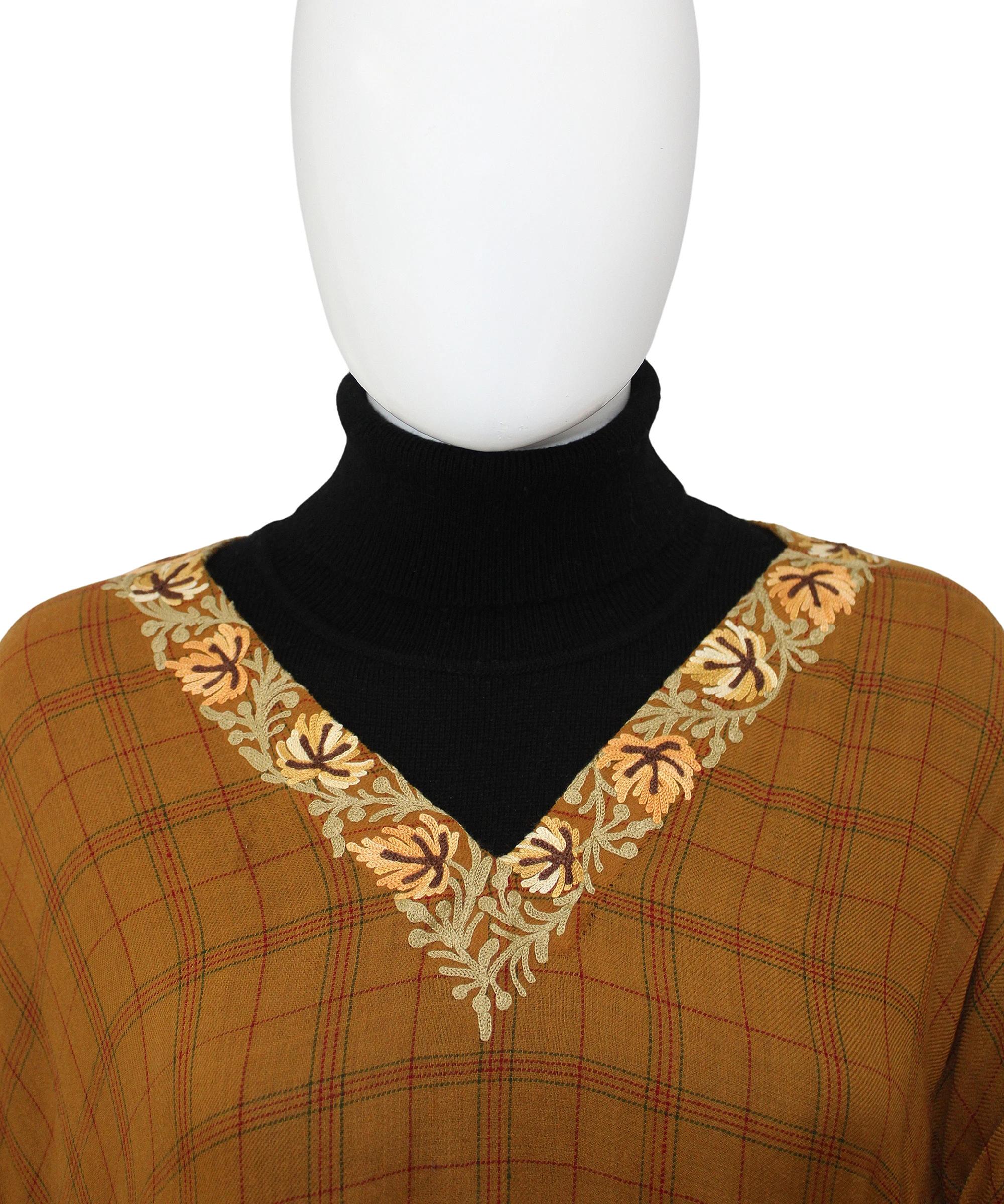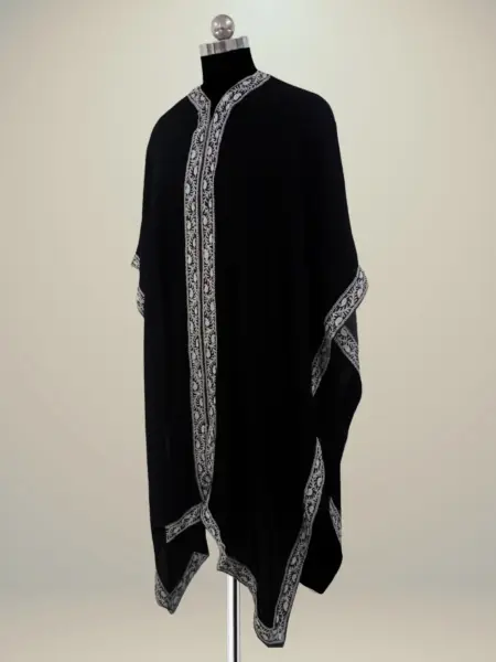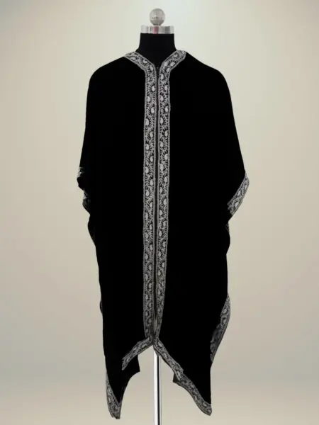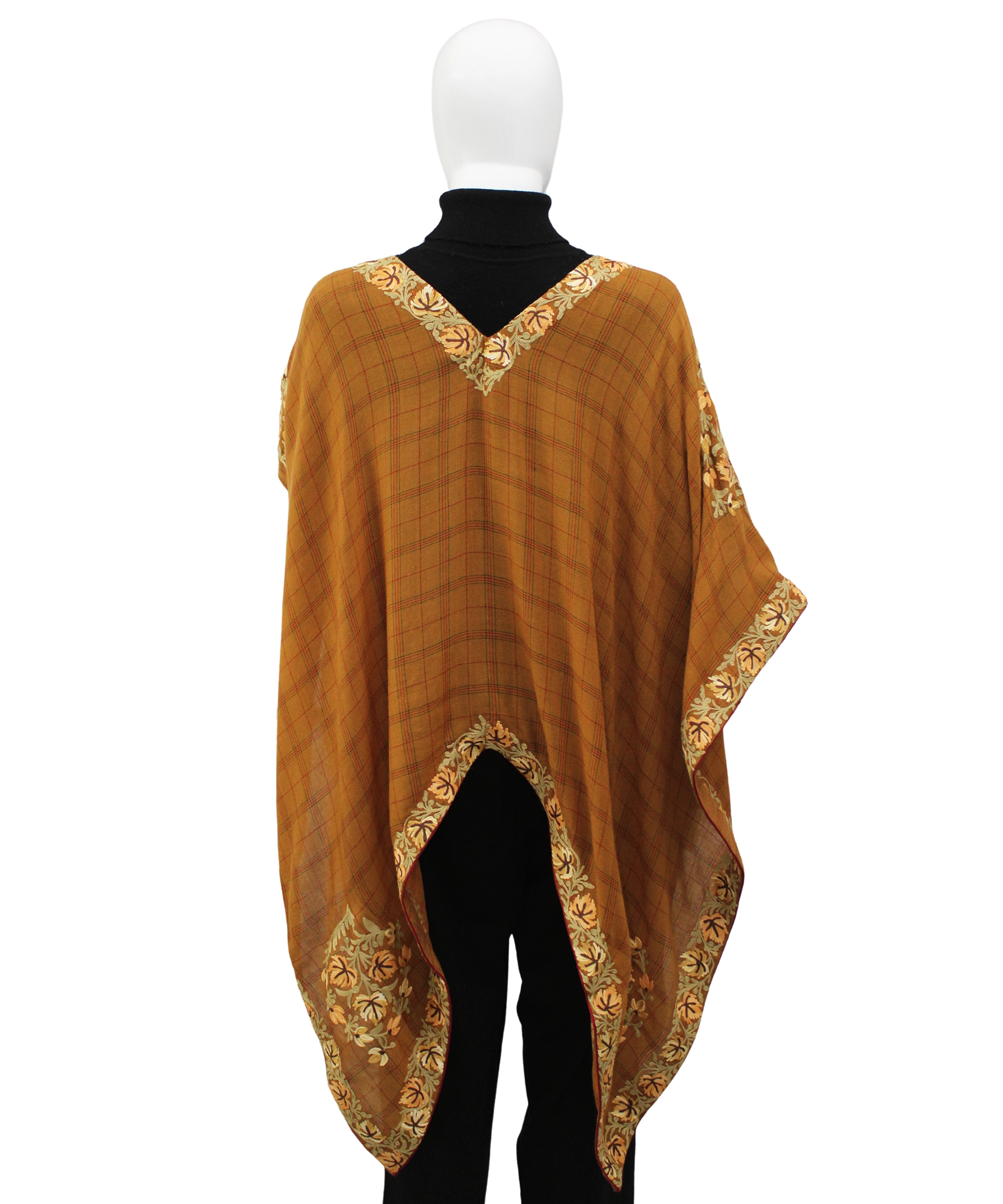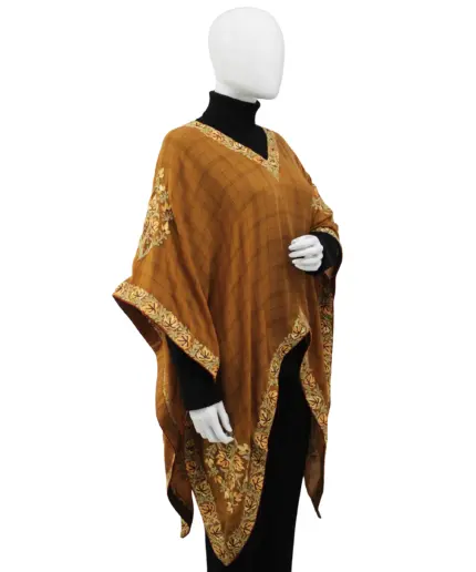 The rust-colored poncho adds warmth and versatility to any outfit, making it a must-have piece for your wardrobe. Intricate Aari embroidery enhances its elegance and reflects rich traditional craftsmanship, adding a refined touch to the design. A stylish border design further elevates its appeal, making it suitable for both casual and formal wear. Crafted from soft, lightweight powerloom Pashmina, this poncho offers comfort and sophistication, perfect for all seasons and occasions.