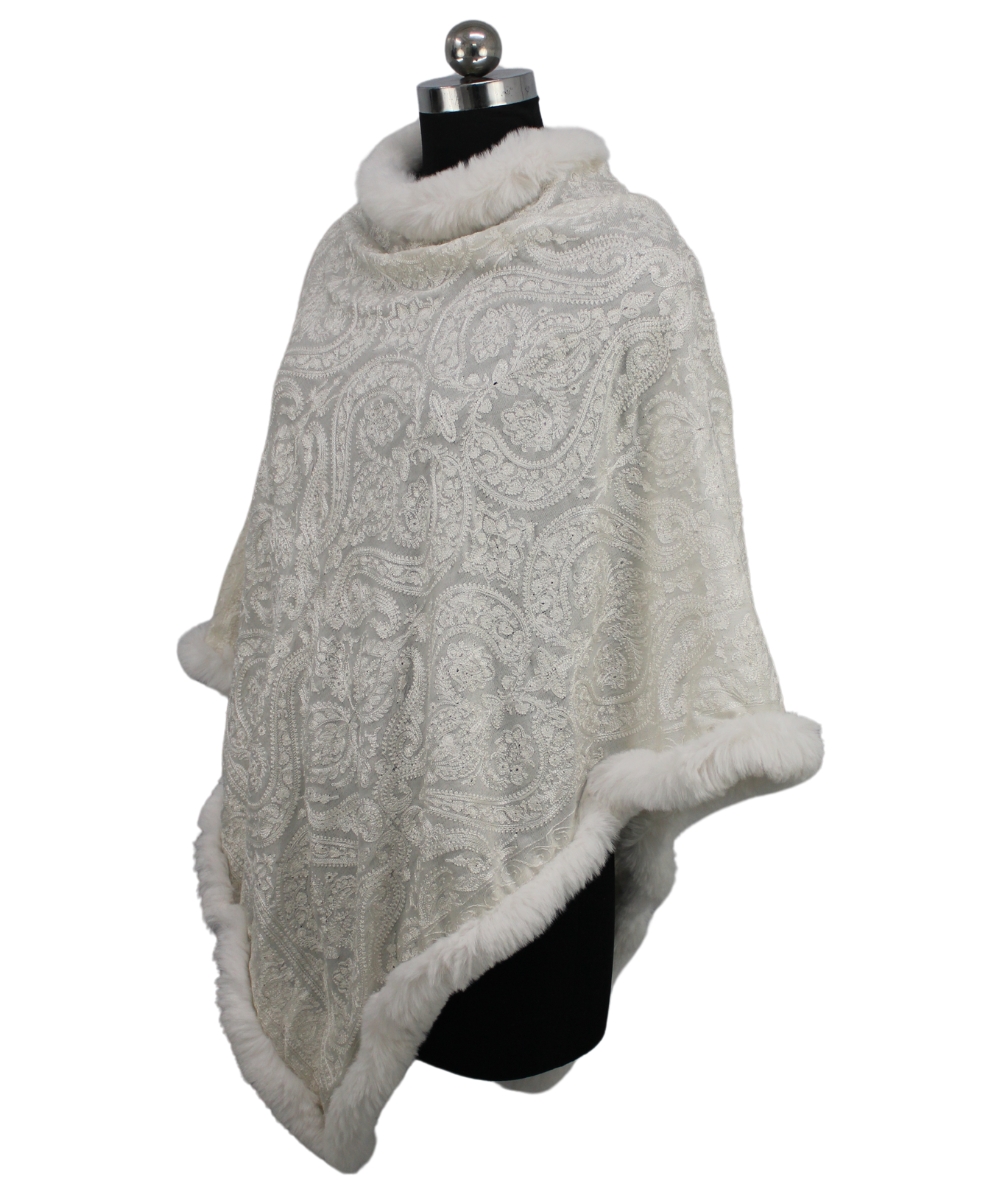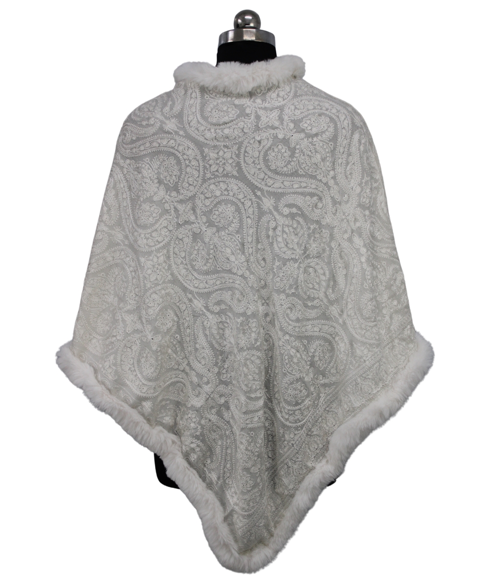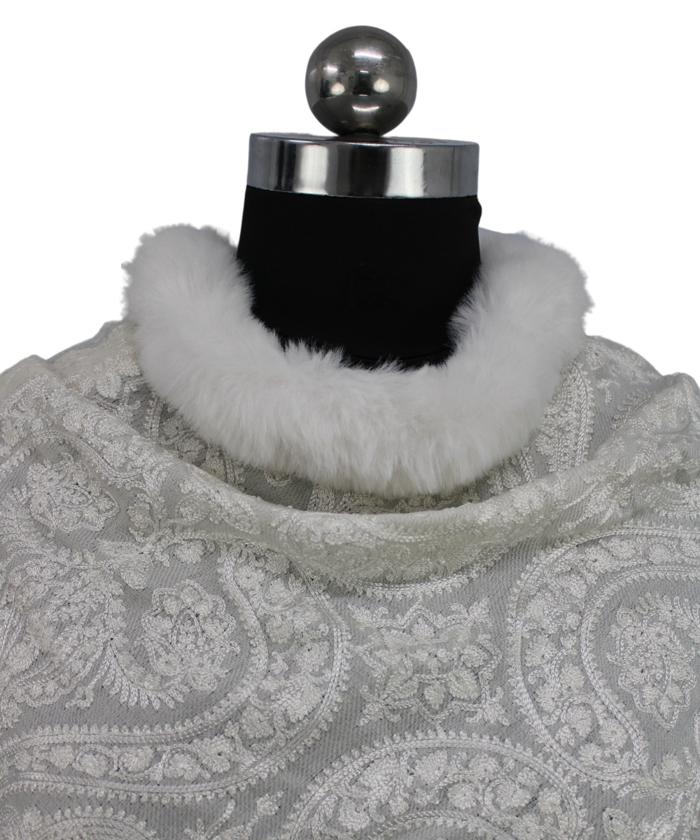 This white Pashmina poncho offers a refined and elegant look, making it a timeless addition to any winter wardrobe. Featuring intricate Aari work in a classic Jamawar design, it beautifully showcases traditional craftsmanship, while the soft fur detailing on the neckline adds a luxurious and cozy touch. Crafted from premium powerloom Pashmina, it ensures long-lasting quality, comfort, and warmth. Ideal for winter wear, this poncho effortlessly blends style with functionality, keeping you warm while maintaining a sophisticated and graceful appearance.