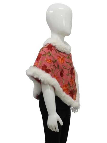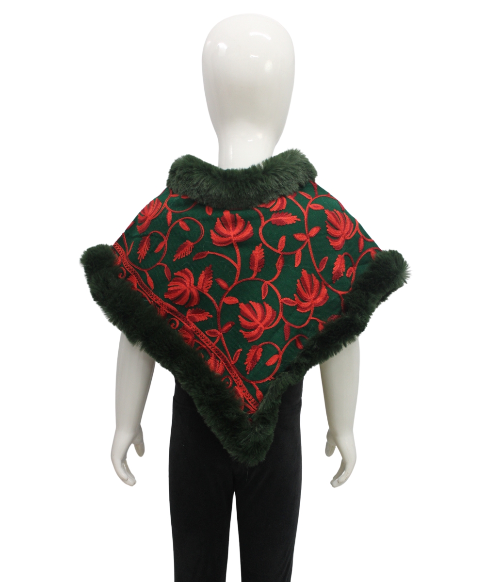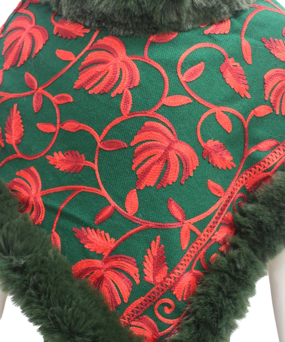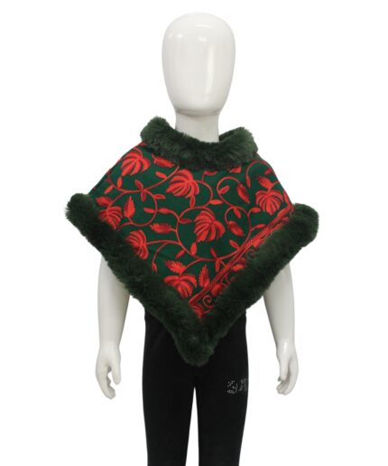 The green poncho delivers a refreshing pop of color, bringing vibrancy and charm to your winter wardrobe. Adorned with intricate Aari work in a graceful jaal design, it showcases detailed craftsmanship, while the addition of fur on the neckline adds a luxurious and cozy touch. Crafted from high-quality powerloom wool, it ensures consistent quality, durability, and lasting comfort. Ideal for winter, this poncho perfectly combines fashionable style with exceptional warmth, making it a stylish and practical choice for cold-weather outings.
