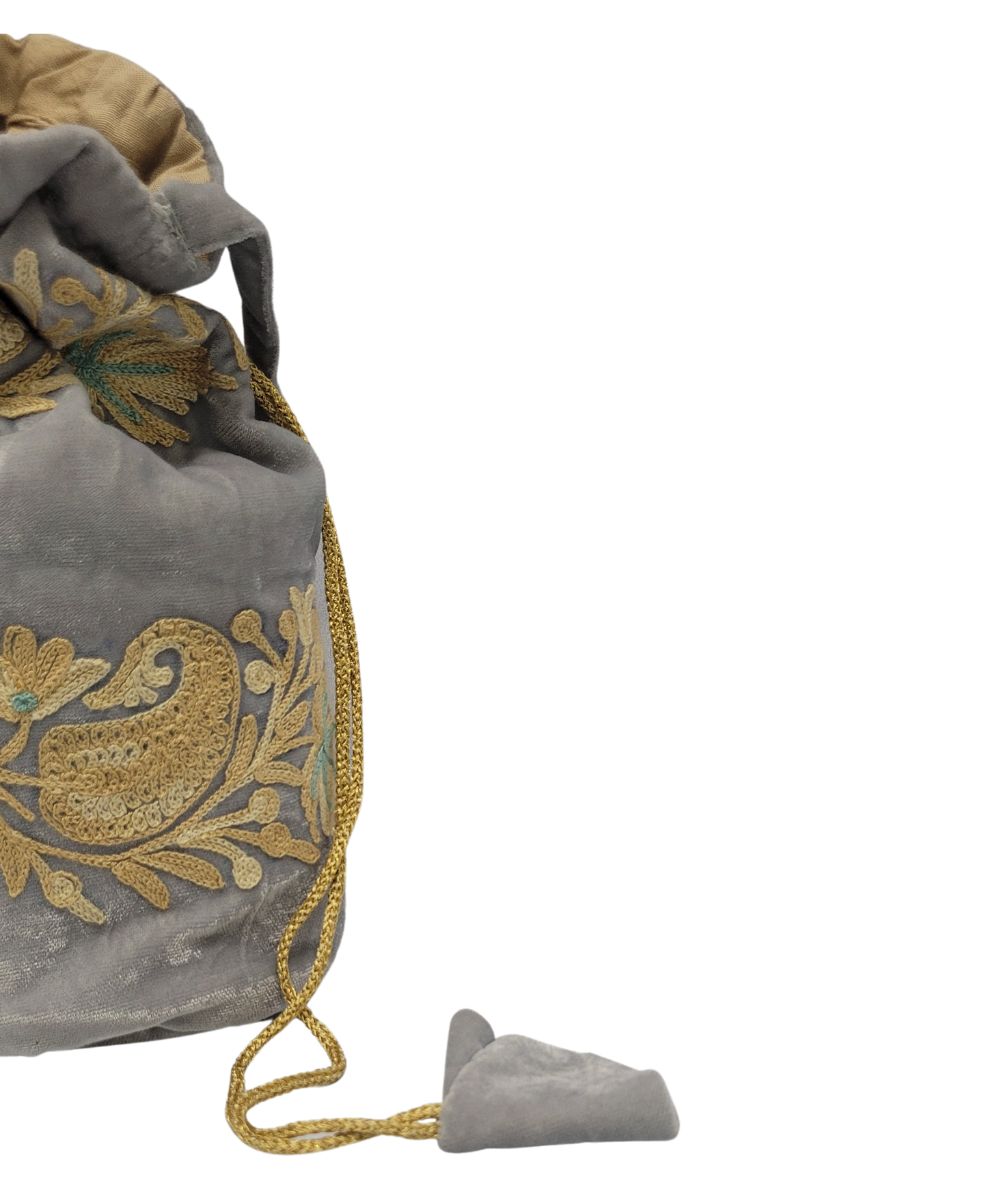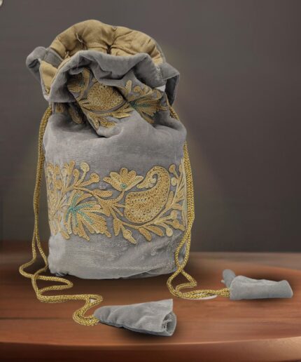 Albasir’s Velvet Potli in a rich grey shade is a timeless accessory that blends elegance with cultural charm. Crafted from premium velvet, it offers a smooth, luxurious texture that enhances its refined appeal. The potli is adorned with intricate Aari embroidery, showcasing the artistry of traditional craftsmanship and adding an elegant, ethnic touch. Designed for both style and function, it features a secure drawstring closure complemented by delicately handmade tassels, lending a graceful finish. Compact yet spacious enough for your essentials, this potli is the perfect companion for weddings, festive gatherings, and special occasions. Whether paired with a saree, lehenga, or ethnic suit, it adds a sophisticated statement to your ensemble and completes your look effortlessly.