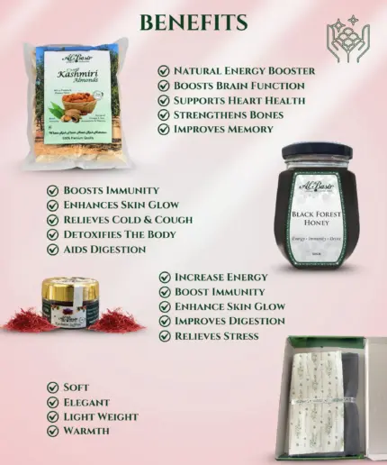 Celebrate every occasion with the richness of Kashmir through our Exclusive Festive Gift Hamper, thoughtfully curated to bring together a blend of wellness, tradition, and luxury. This elegant hamper features the pure sweetness of Black Forest Honey, the wholesome crunch of Kashmiri Almond Shells, and the aromatic richness of premium Kashmiri Saffron. Adding a touch of grace and warmth, it also includes a beautifully crafted Kashmiri Shawl. Perfect for festive gifting, this hamper captures the soul of Kashmir in every detail—an ideal choice for those who cherish authenticity and elegance.