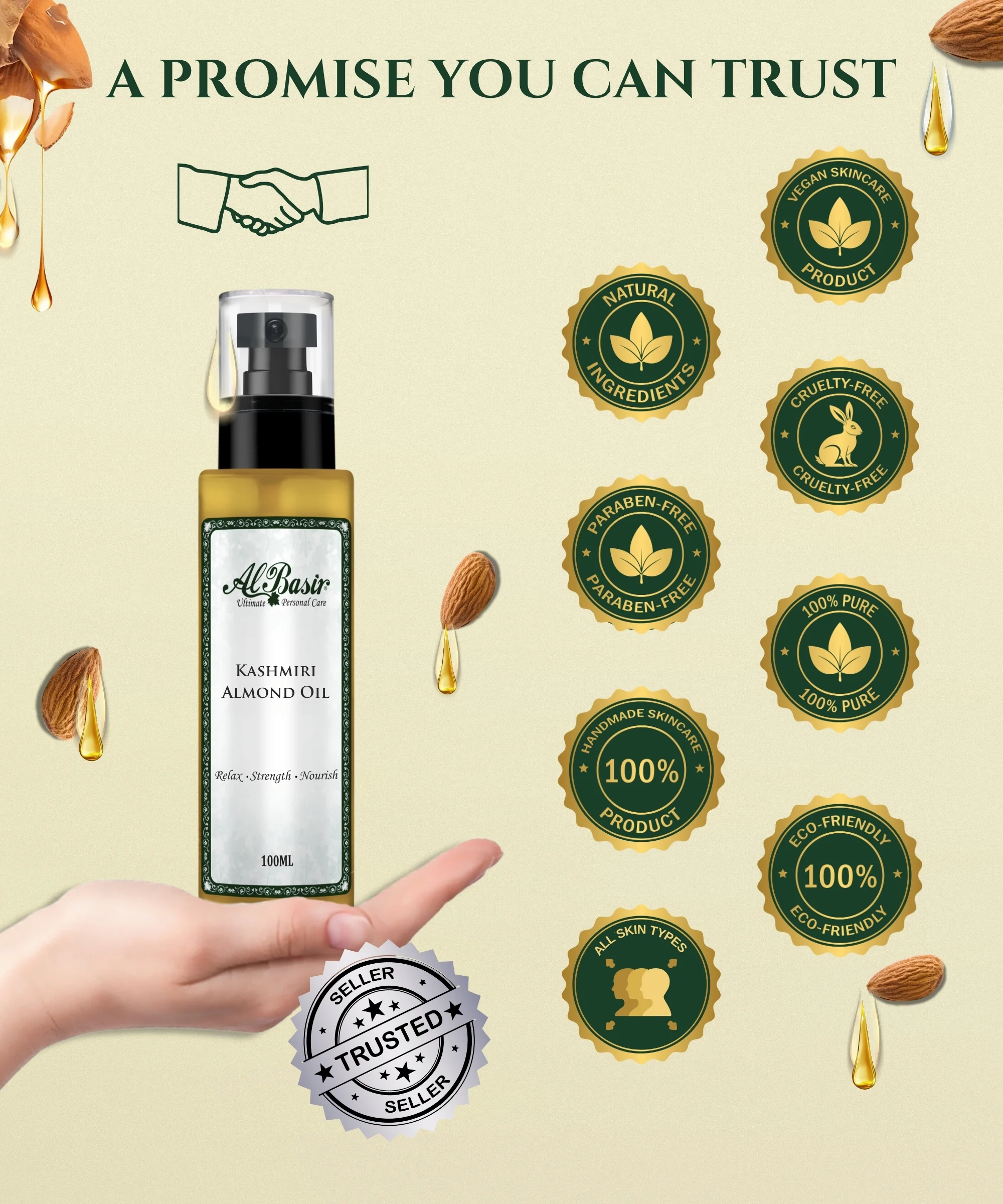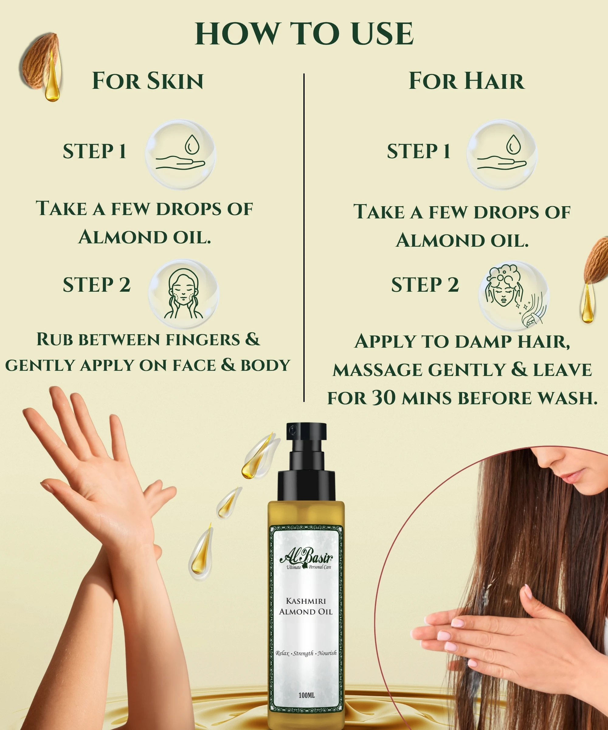Kashmiri Almond Oil is more than just a beauty oil—it’s a natural, multipurpose remedy for skin, hair, and even baby care. Rich in Vitamin E, antioxidants, and healthy fats, its light texture makes it ideal for daily use. Here’s how you can make the most of it.
