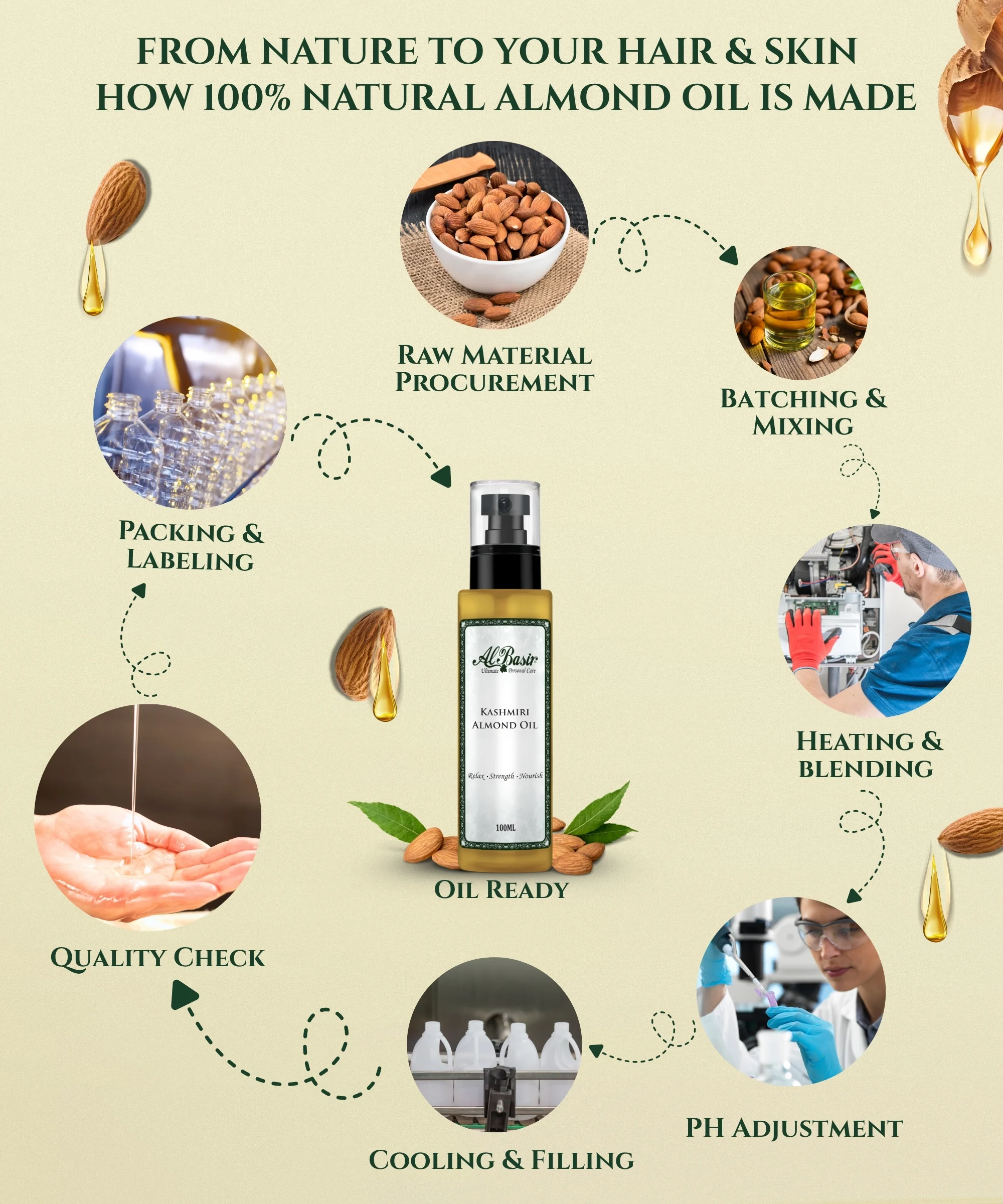 Deeply Moisturizes Skin: This nutrient-rich oil helps brighten dull skin and even out discoloration. Antioxidants and vitamin E promote cell renewal, reducing redness and pigmentation. With regular use, Kashmiri almond oil reveals a radiant, balanced complexion—naturally glowing, without harsh chemicals or artificial brighteners. Perfect for achieving smooth, luminous skin.