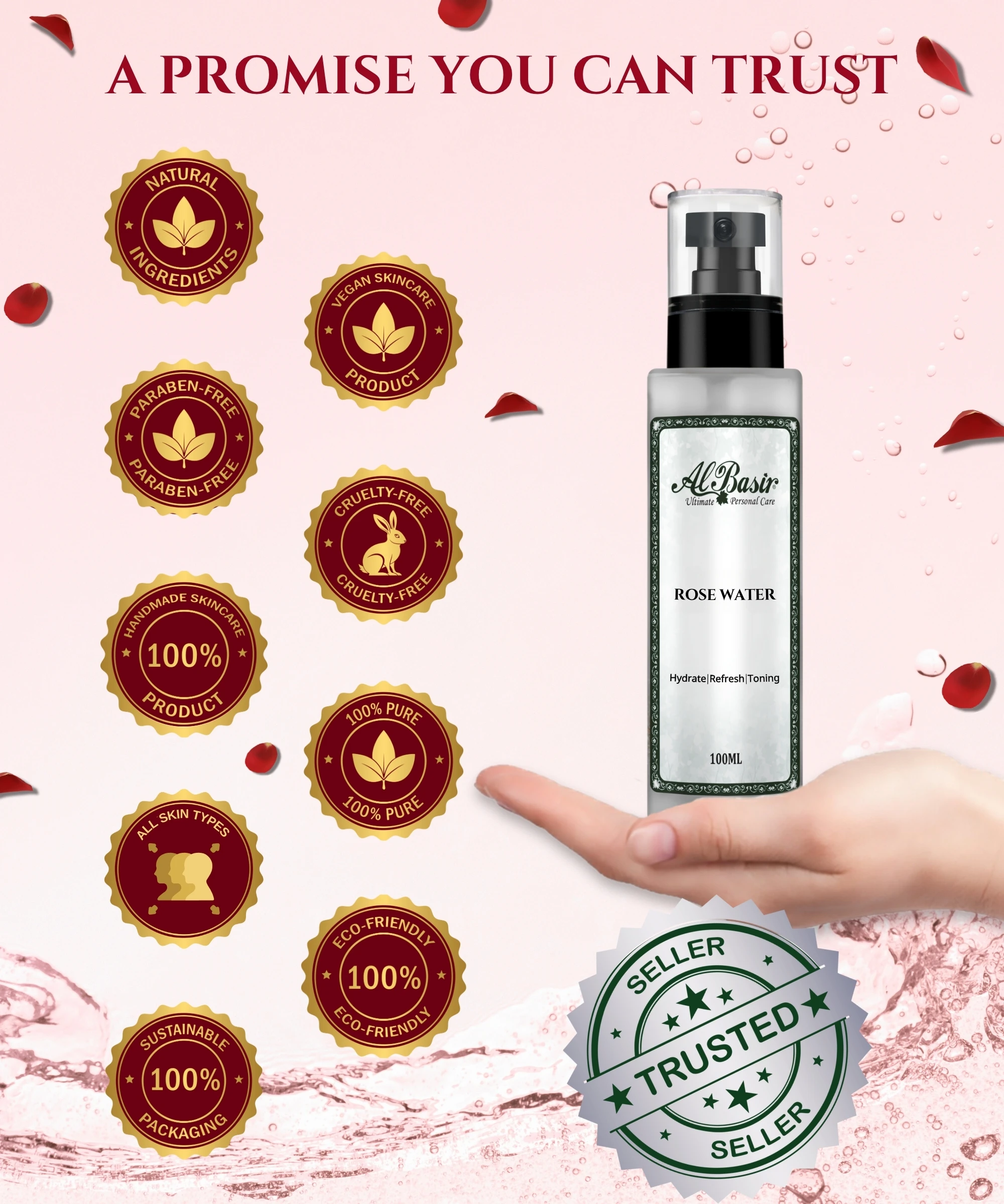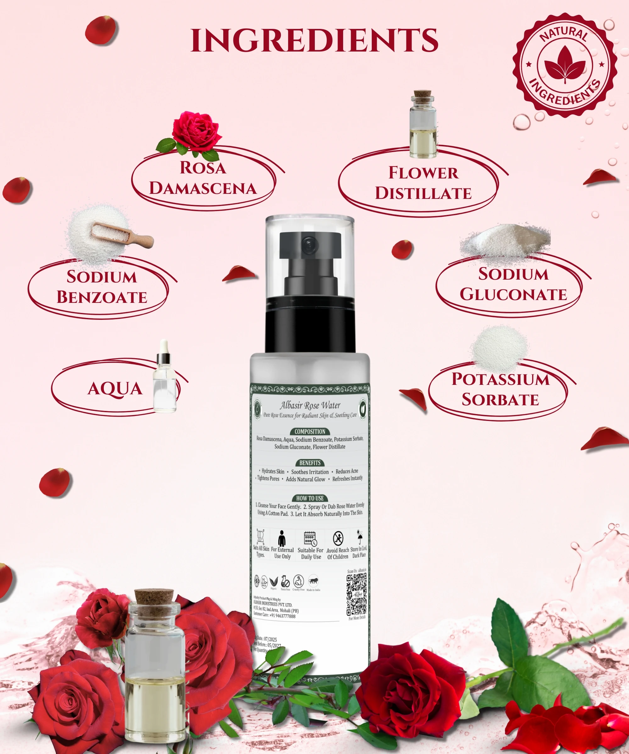 Albasir Organic Rose Water is a refreshing, skin-loving floral toner made from pure Rosa Damascena flower distillate. Known for its soothing, toning, and hydrating properties, this gentle water delivers a delicate burst of moisture to tired, irritated, or stressed skin—leaving it instantly refreshed and naturally radiant.