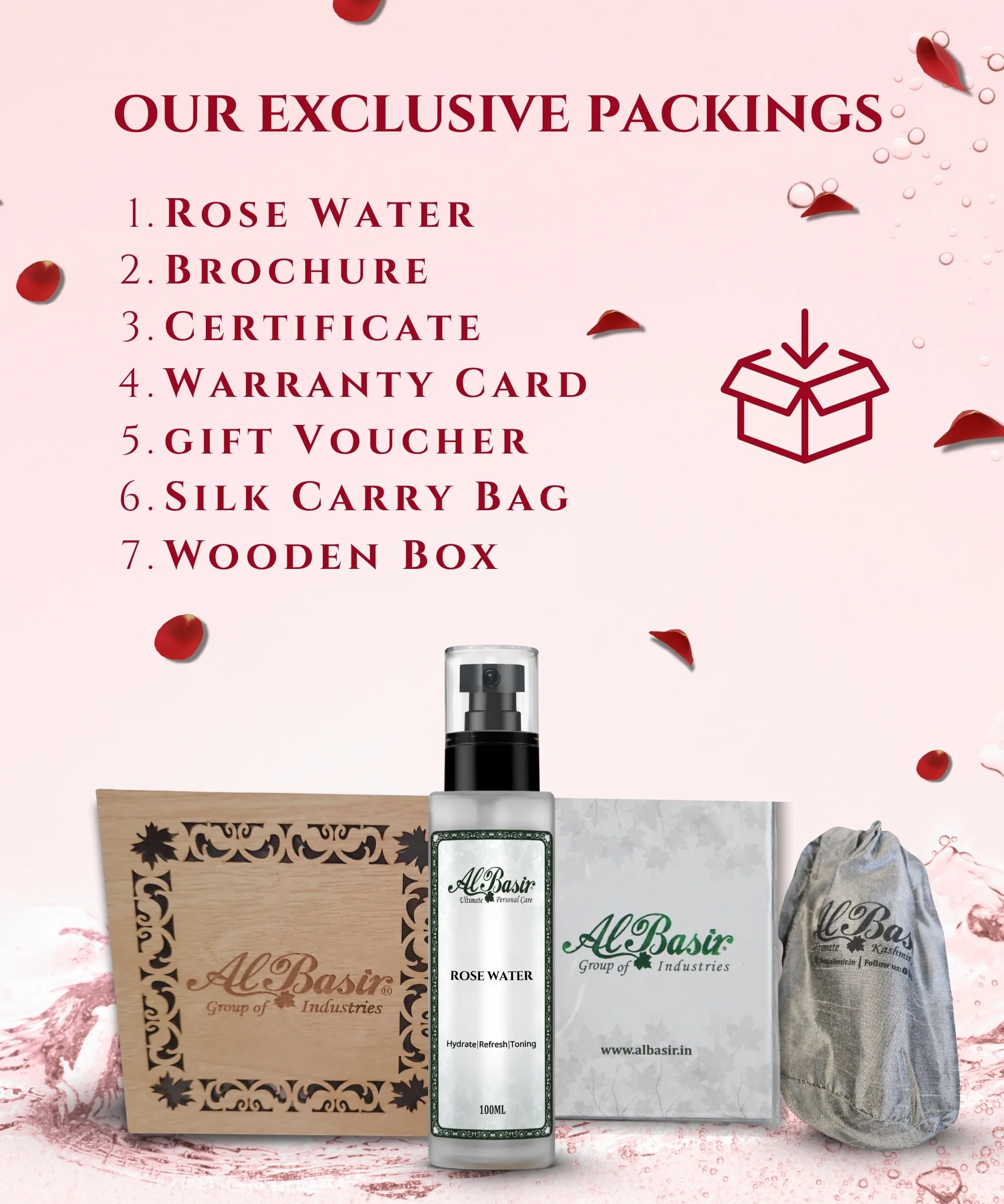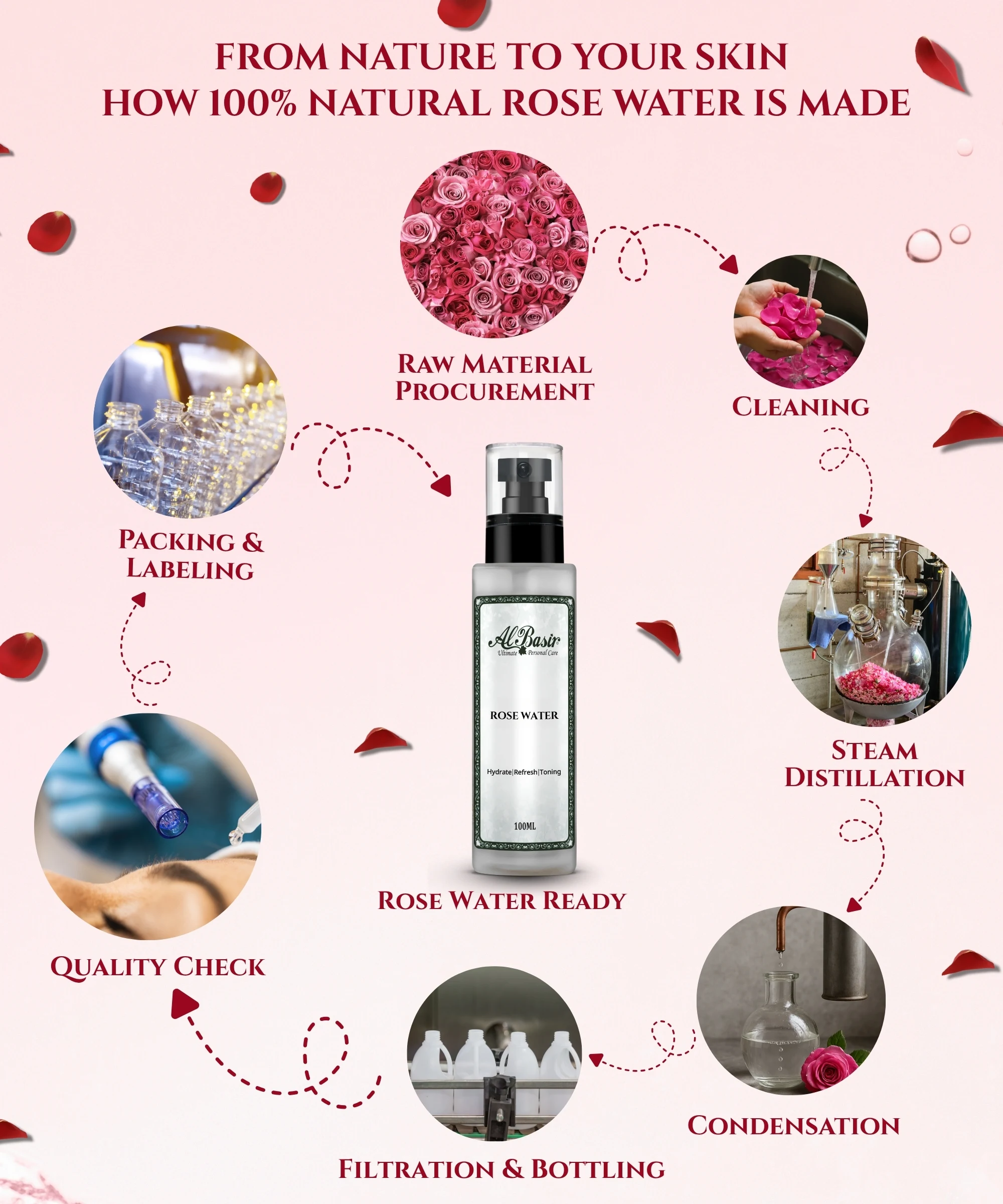 At Albasir, our Rose Water is made using the traditional steam distillation method — a time-honored process that captures the pure essence of Rosa Damascena petals.
