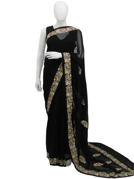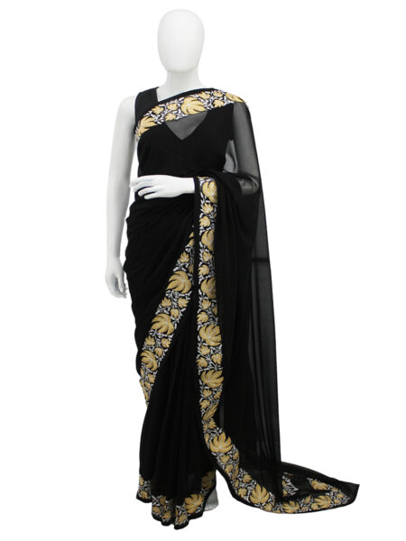 Experience timeless beauty with this stunning black saree, crafted to exude sophistication and grace. The rich black tone offers a bold yet classic appeal, making it an ideal choice for both traditional and contemporary occasions. Its refined design enhances the elegance of the fabric, allowing you to make a graceful statement with minimal effort. Whether worn for festive events, evening gatherings, or formal celebrations, this saree captures attention with its understated charm. Pair it with statement jewelry or keep it minimal—either way, this exquisite black saree ensures you radiate confidence, style, and timeless elegance wherever you go.