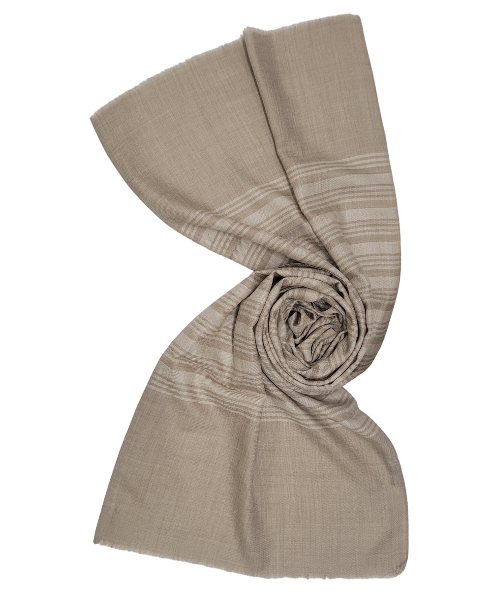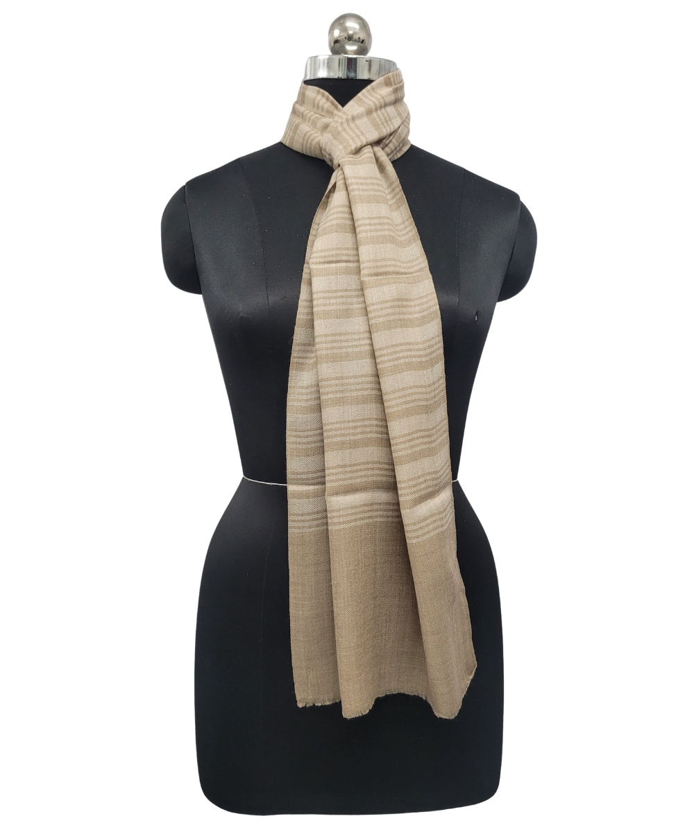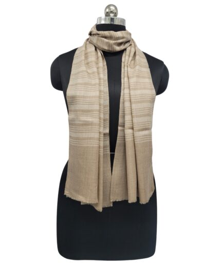 Timeless and versatile, Albasir’s Stripes Pashmina Scarf in elegant beige adds a touch of subtle sophistication to any wardrobe. Expertly crafted from luxurious handloom Pashmina, this scarf offers exceptional softness, warmth, and a feather-light feel—perfect for year-round comfort. Each thread in the handloom weave reflects skilled artistry and deep-rooted tradition, creating a naturally textured and refined finish. The sleek stripe design brings structure and modern appeal while maintaining a classic look that never goes out of style. Ideal for both casual and formal occasions, this beige Pashmina scarf drapes effortlessly and complements a wide range of outfits. Elevate your everyday attire with the charm, craftsmanship, and elegance of this beautifully woven striped Pashmina accessory.