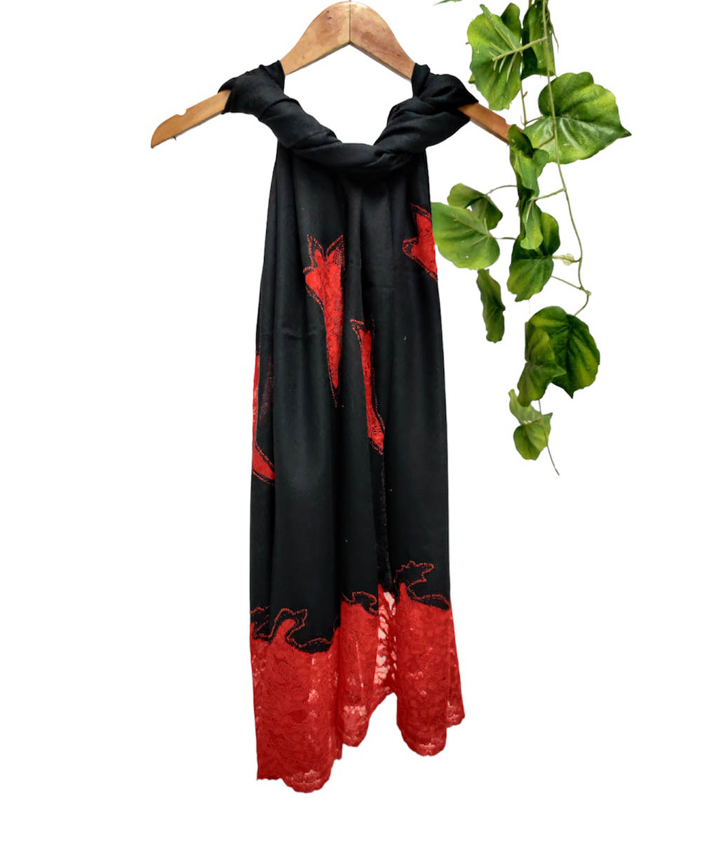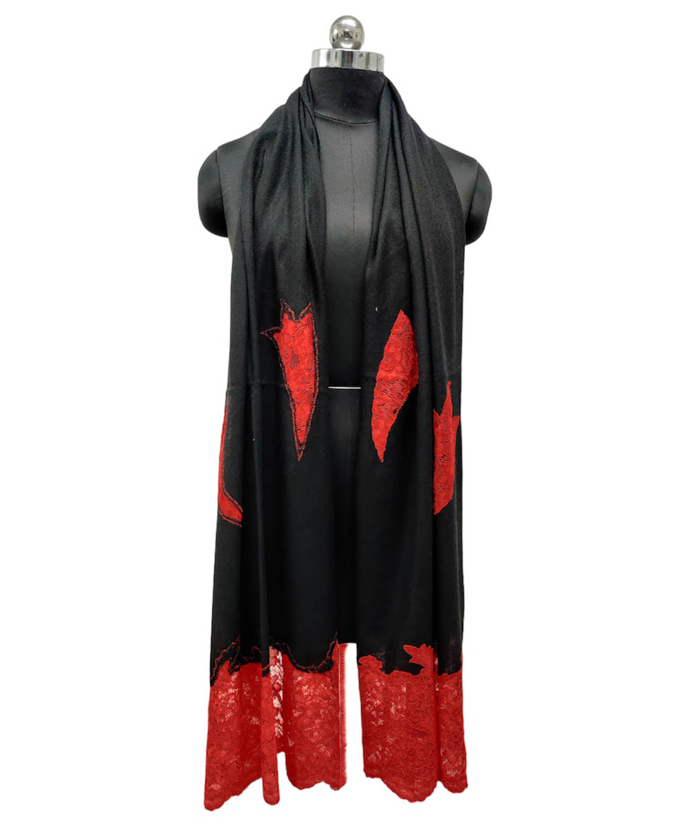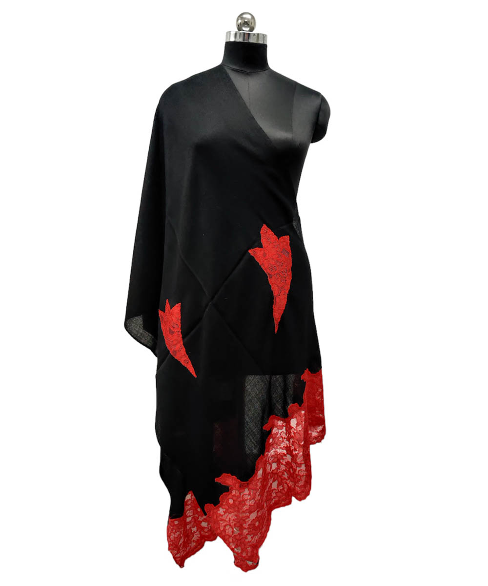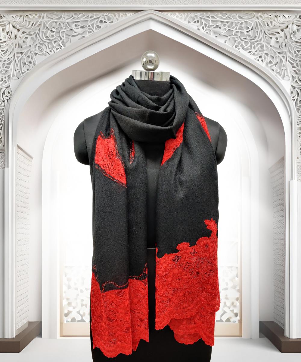 Make a bold style statement with the Albasir Designer Pashmina Stole, elegantly handcrafted in striking red and black hues that exude sophistication and charm. This exquisite stole showcases expert artistry through delicate lace work and intricate appliqué detailing, creating a rich visual appeal. The thoughtfully placed motifs and beautifully crafted border design reflect authentic craftsmanship and cultural elegance. Made from premium quality handloom pashmina fabric, it offers a luxuriously soft texture, lightweight warmth, and lasting comfort. Whether worn over traditional attire or paired with modern ensembles, this designer stole adds a refined and artistic touch to any look. Elevate your wardrobe with the Albasir Red & Black Designer Pashmina Stole—where timeless tradition meets contemporary elegance.
