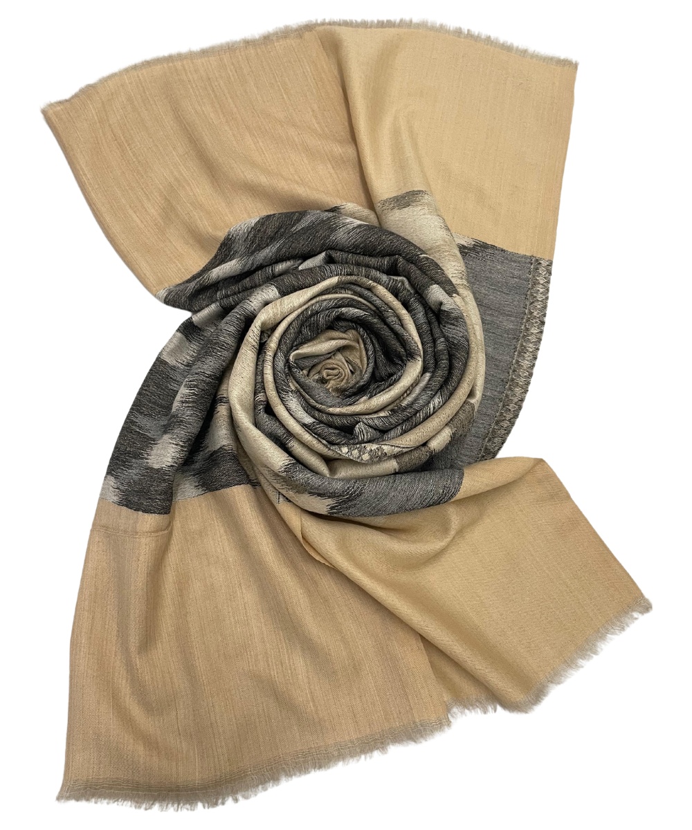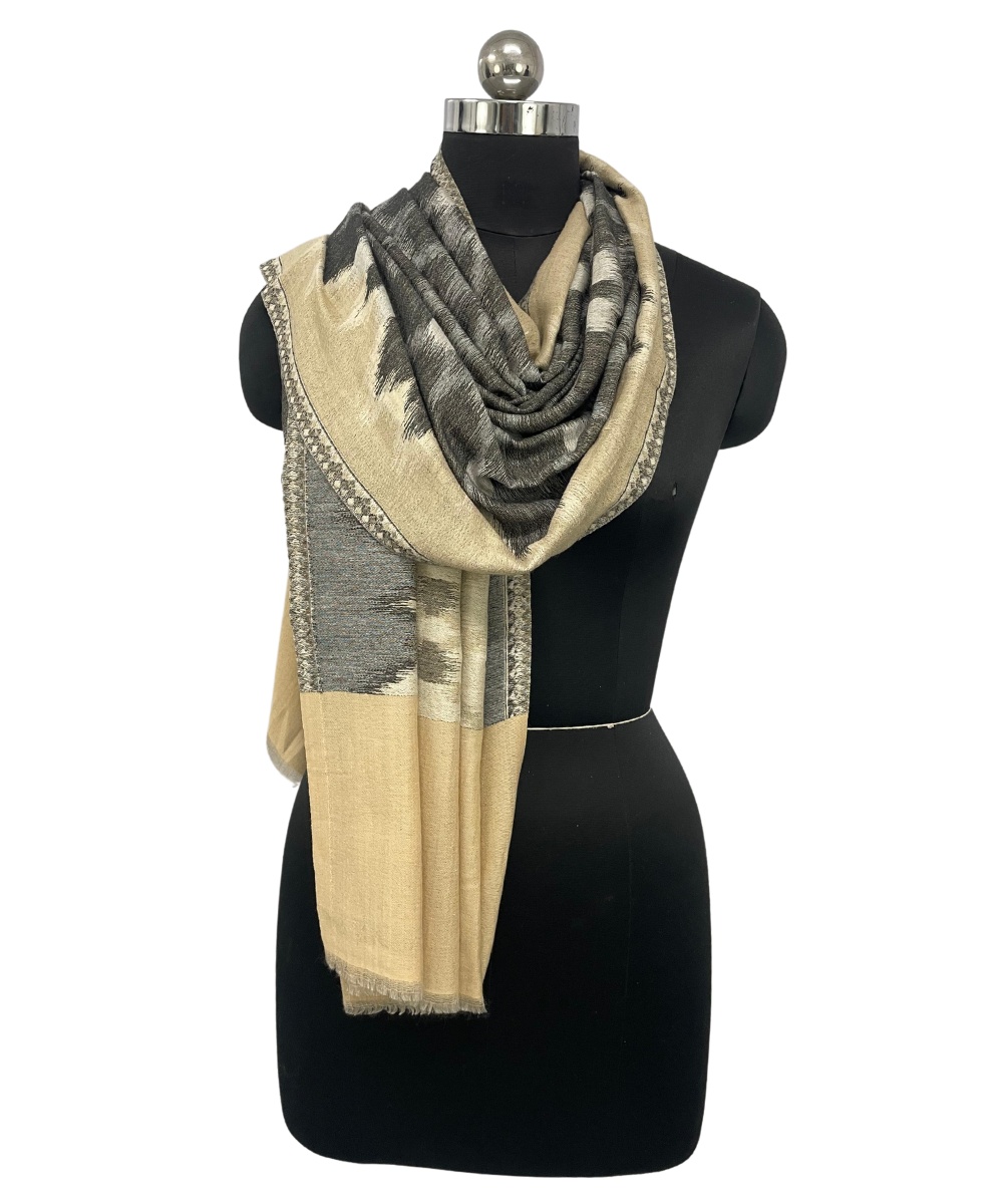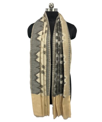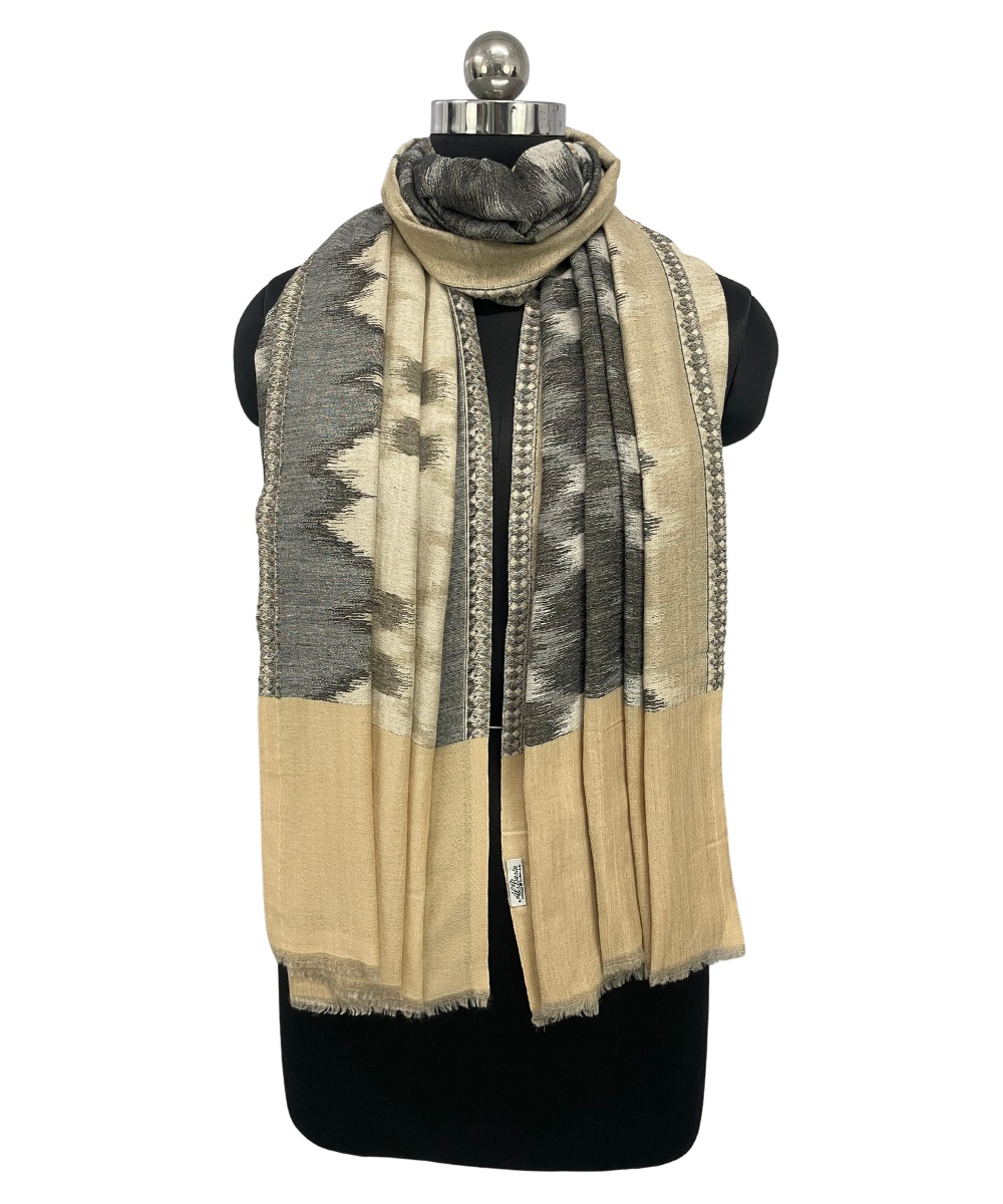 Enhance your winter wardrobe with the Albasir Ikat Reversible Stole, crafted in elegant soft beige and grey tones for a sophisticated look. This stole showcases an intricate reversible Ikat pattern, blending traditional artistry with contemporary style. Made from the finest quality handloom Pashmina, it offers unmatched softness, warmth, and a luxurious drape that feels gentle against the skin. Lightweight yet cozy, this versatile stole is perfect for both casual outings and festive occasions, adding a refined touch to any ensemble. Whether layered over western wear or ethnic attire, the Albasir beige and grey Ikat stole effortlessly elevates your style with timeless charm and comfort, making it a must-have accessory for the winter season.
