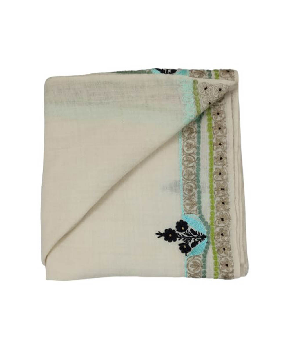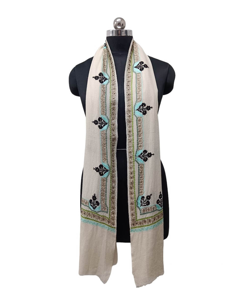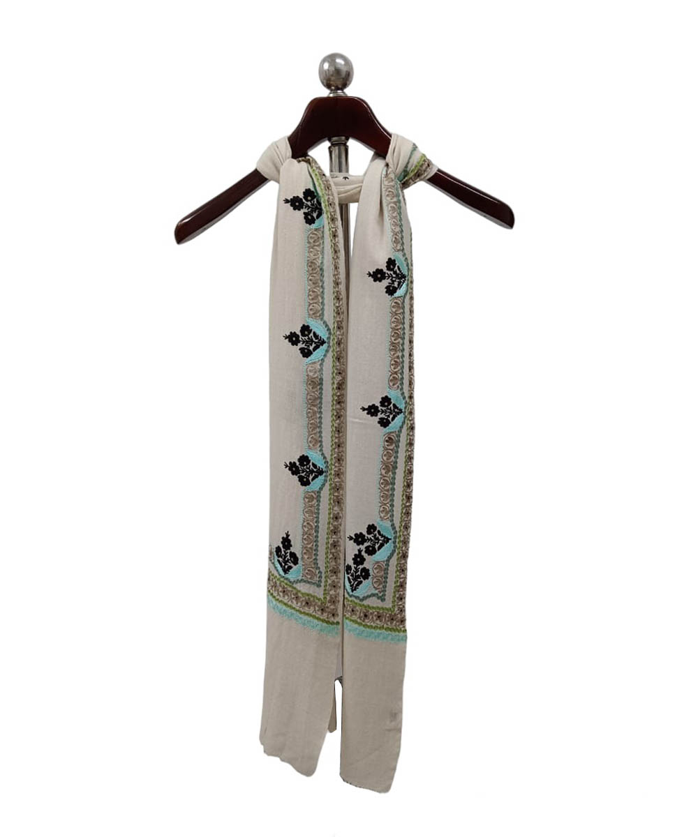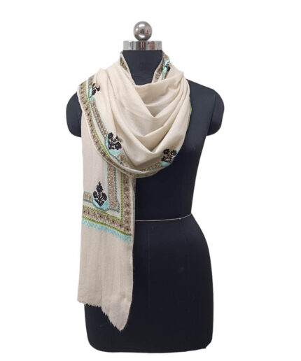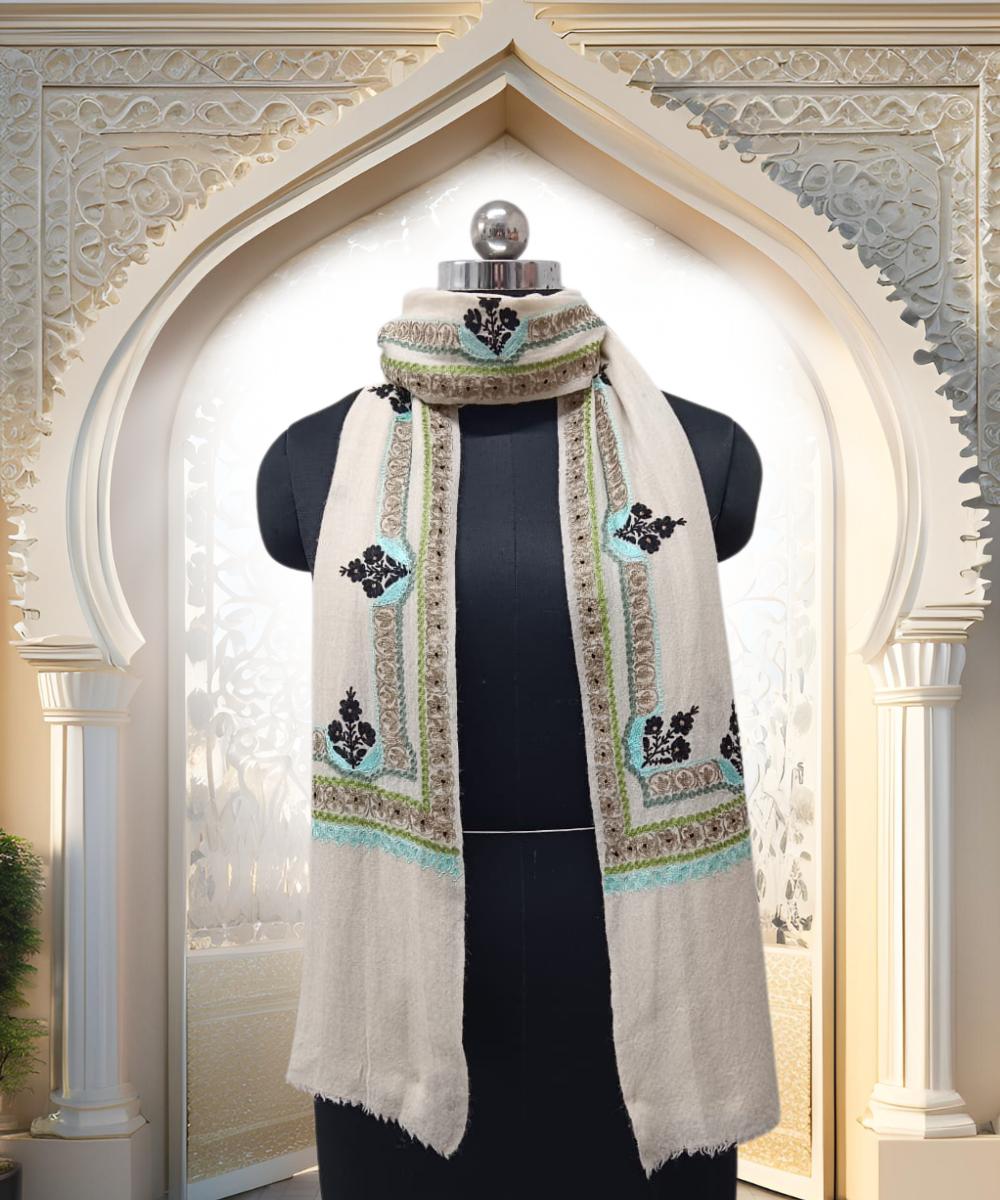 Embrace timeless elegance with the Albasir White Pashmina Stole, a graceful handloom creation in a pure white shade that exudes sophistication. Expertly crafted from high-quality pashmina fabric, it offers unmatched softness, warmth, and comfort. The stole is beautifully adorned with delicate Zari and Aari embroidery along the borders, adding a refined touch of traditional artistry. Its subtle yet intricate detailing makes it a versatile accessory that pairs effortlessly with both traditional and western ensembles. Whether worn at festive occasions, formal gatherings, or as a chic everyday wrap, this stole brings a sense of luxury and charm to any outfit. Elevate your wardrobe with this elegant piece from Albasir—a true celebration of fine craftsmanship and timeless style.