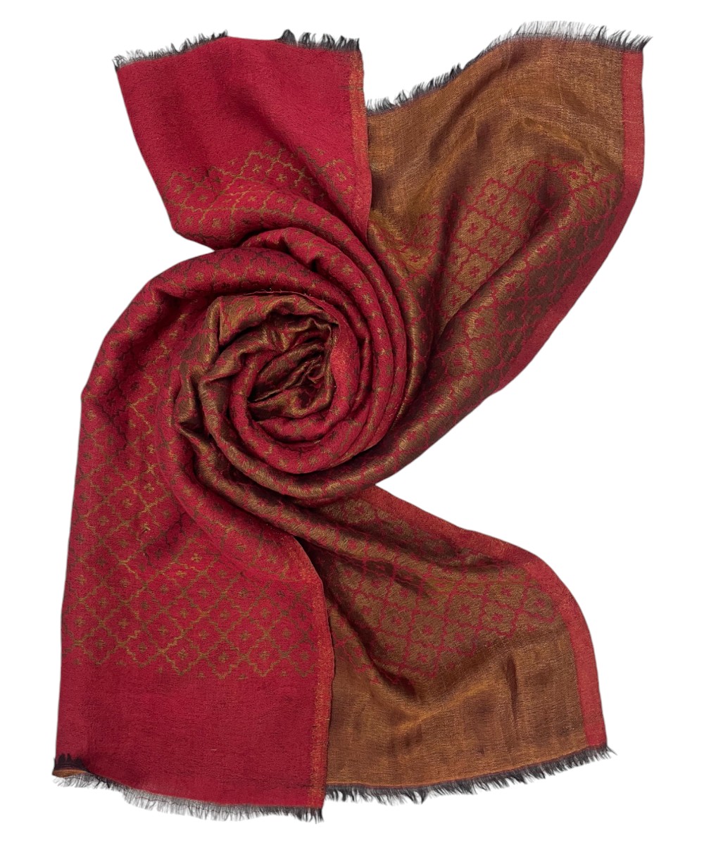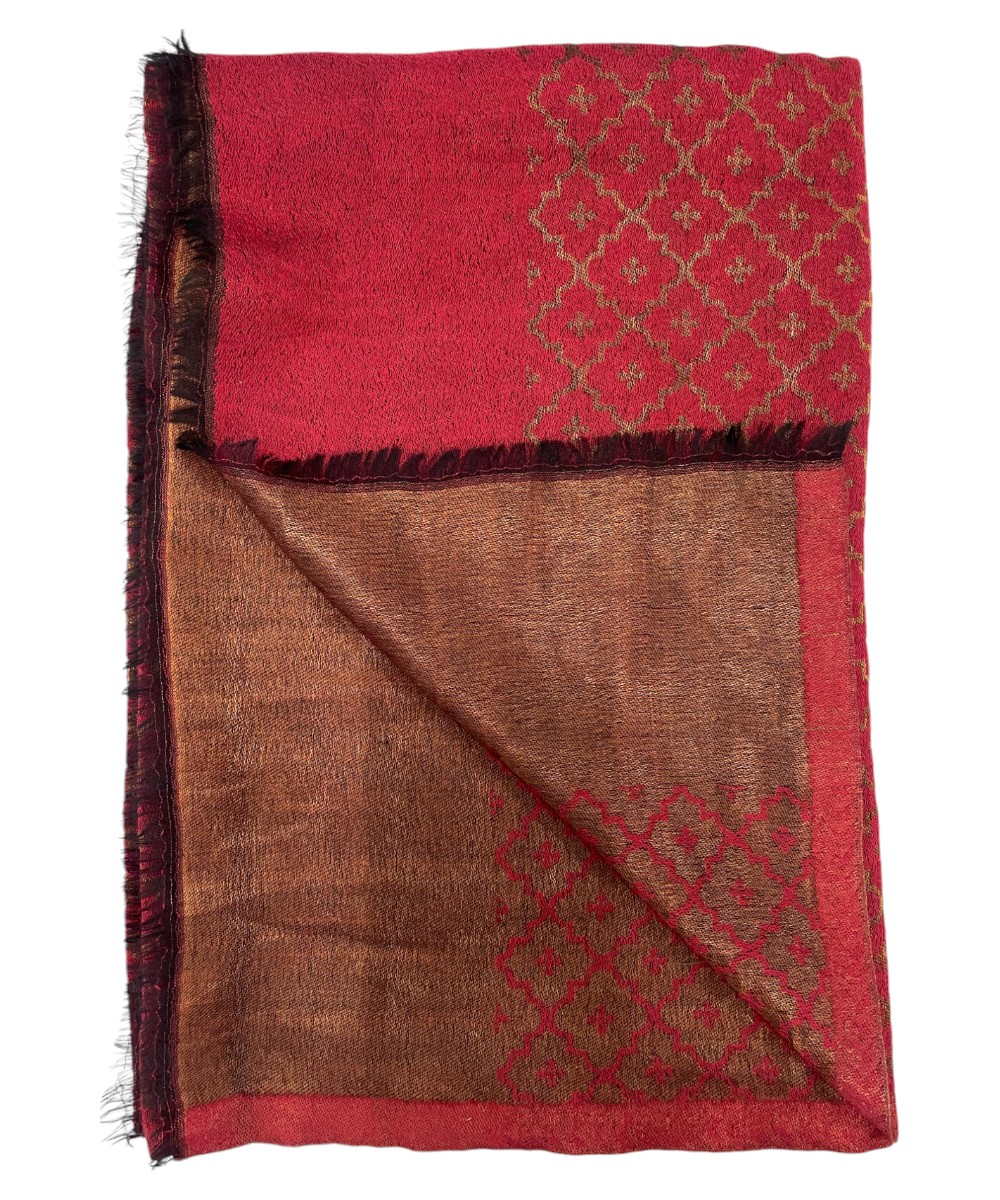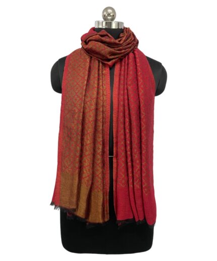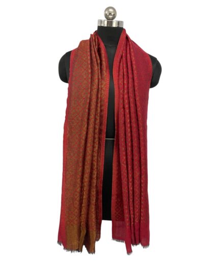 Make a bold and elegant statement with the Albasir Zari Reversible Stole, where vibrant red meets shimmering gold in perfect harmony. This luxurious stole features an intricate reversible jaal design, beautifully highlighted with fine zari threading that reflects traditional craftsmanship and refined style. Woven from the finest quality handloom Pashmina, it offers unmatched softness, warmth, and a graceful drape that feels luxurious against the skin. The radiant color combination and delicate zari detailing make it ideal for festive occasions, weddings, or formal gatherings. Whether paired with a saree, suit, or contemporary outfit, this versatile stole complements any attire effortlessly. The Albasir red and gold zari stole is the perfect blend of cultural richness and timeless fashion.