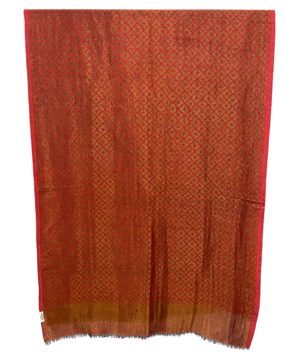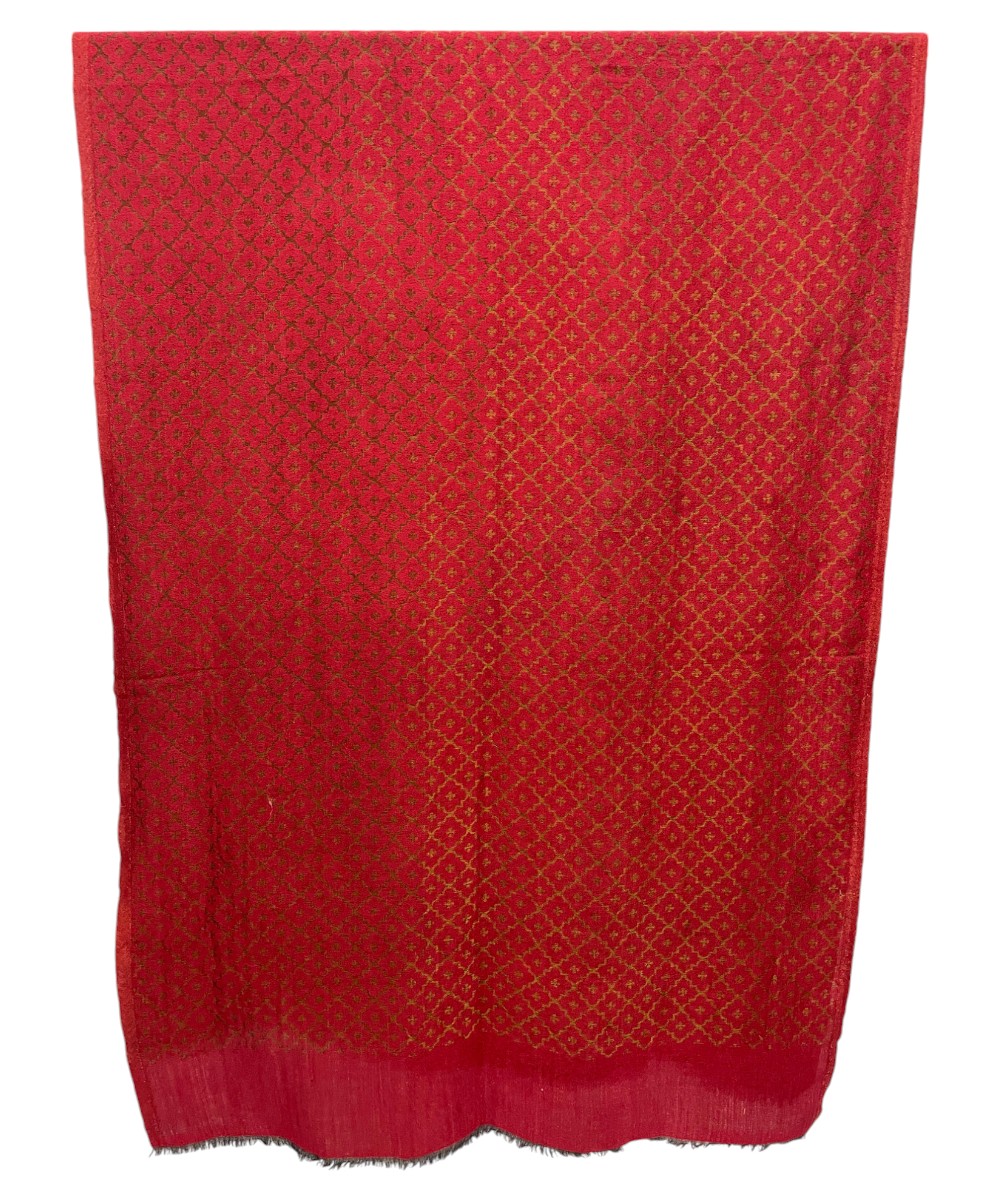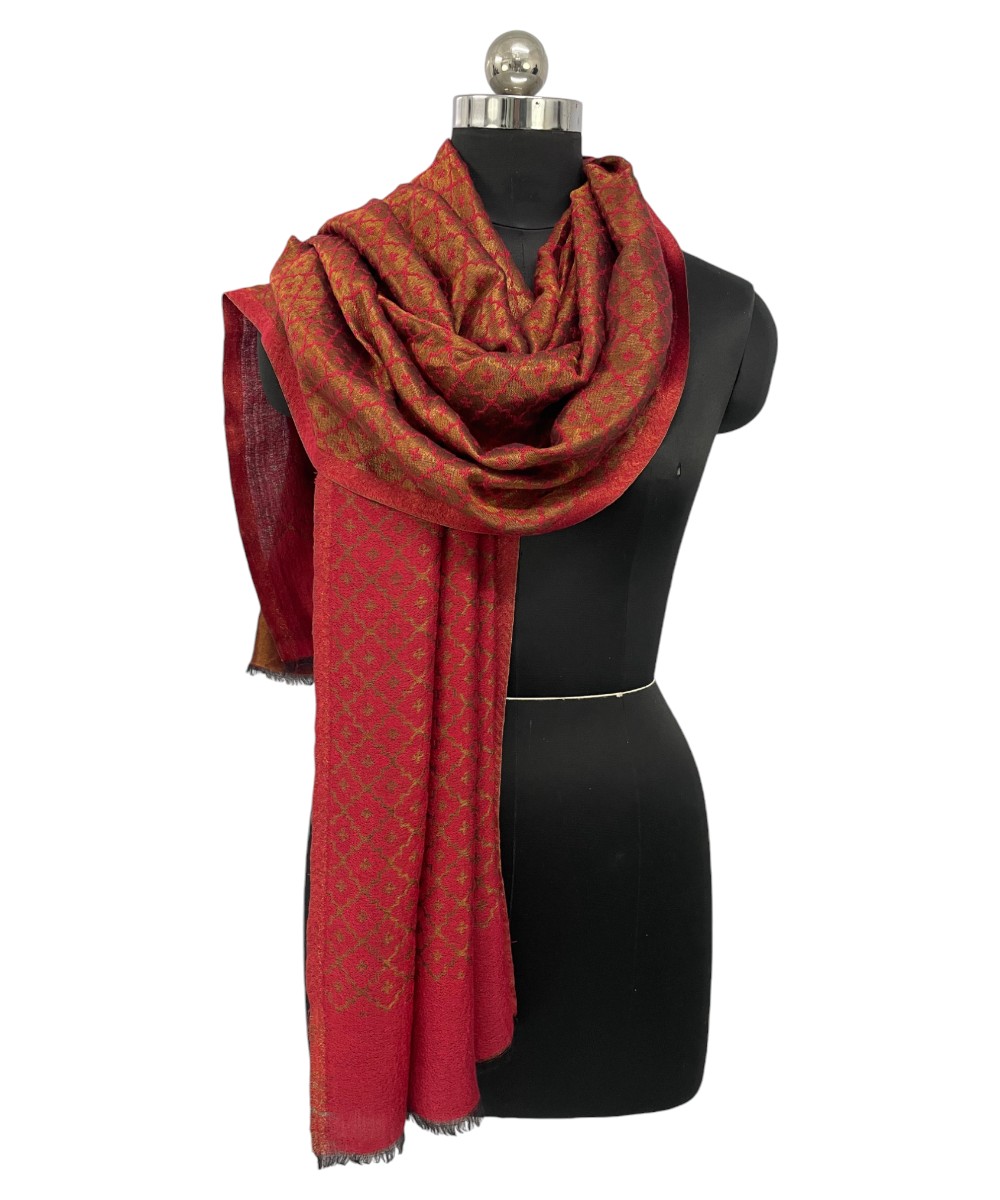 Make a bold and elegant statement with the Albasir Zari Reversible Stole, where vibrant red meets shimmering gold in perfect harmony. This luxurious stole features an intricate reversible jaal design, beautifully highlighted with fine zari threading that reflects traditional craftsmanship and refined style. Woven from the finest quality handloom Pashmina, it offers unmatched softness, warmth, and a graceful drape that feels luxurious against the skin. The radiant color combination and delicate zari detailing make it ideal for festive occasions, weddings, or formal gatherings. Whether paired with a saree, suit, or contemporary outfit, this versatile stole complements any attire effortlessly. The Albasir red and gold zari stole is the perfect blend of cultural richness and timeless fashion.