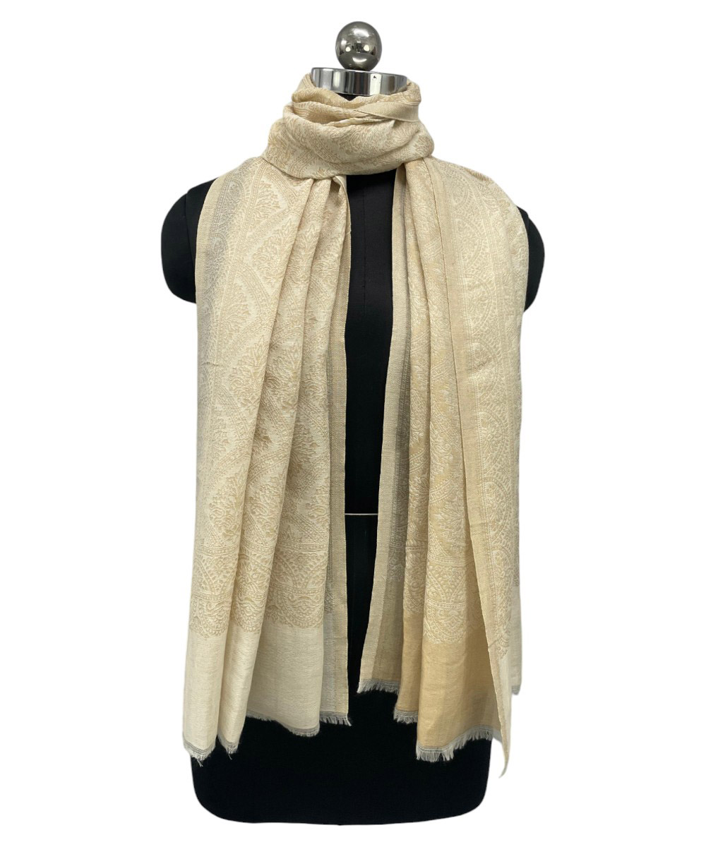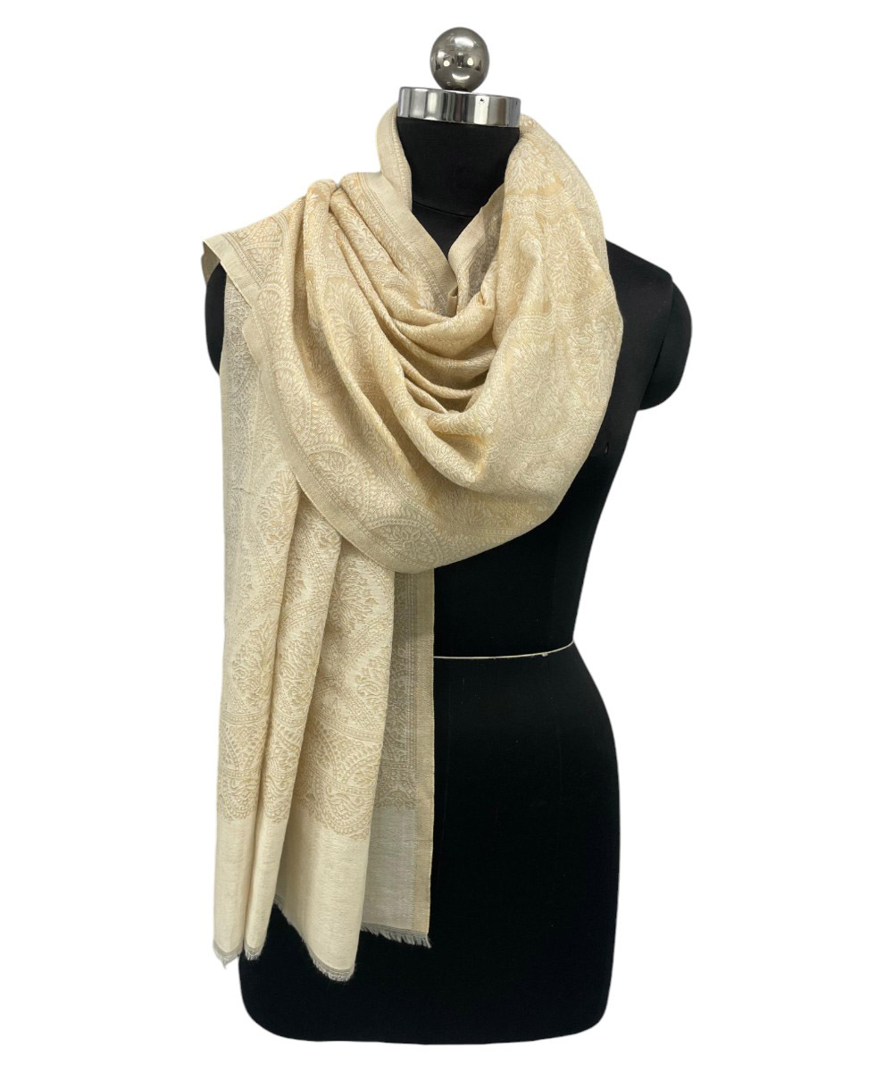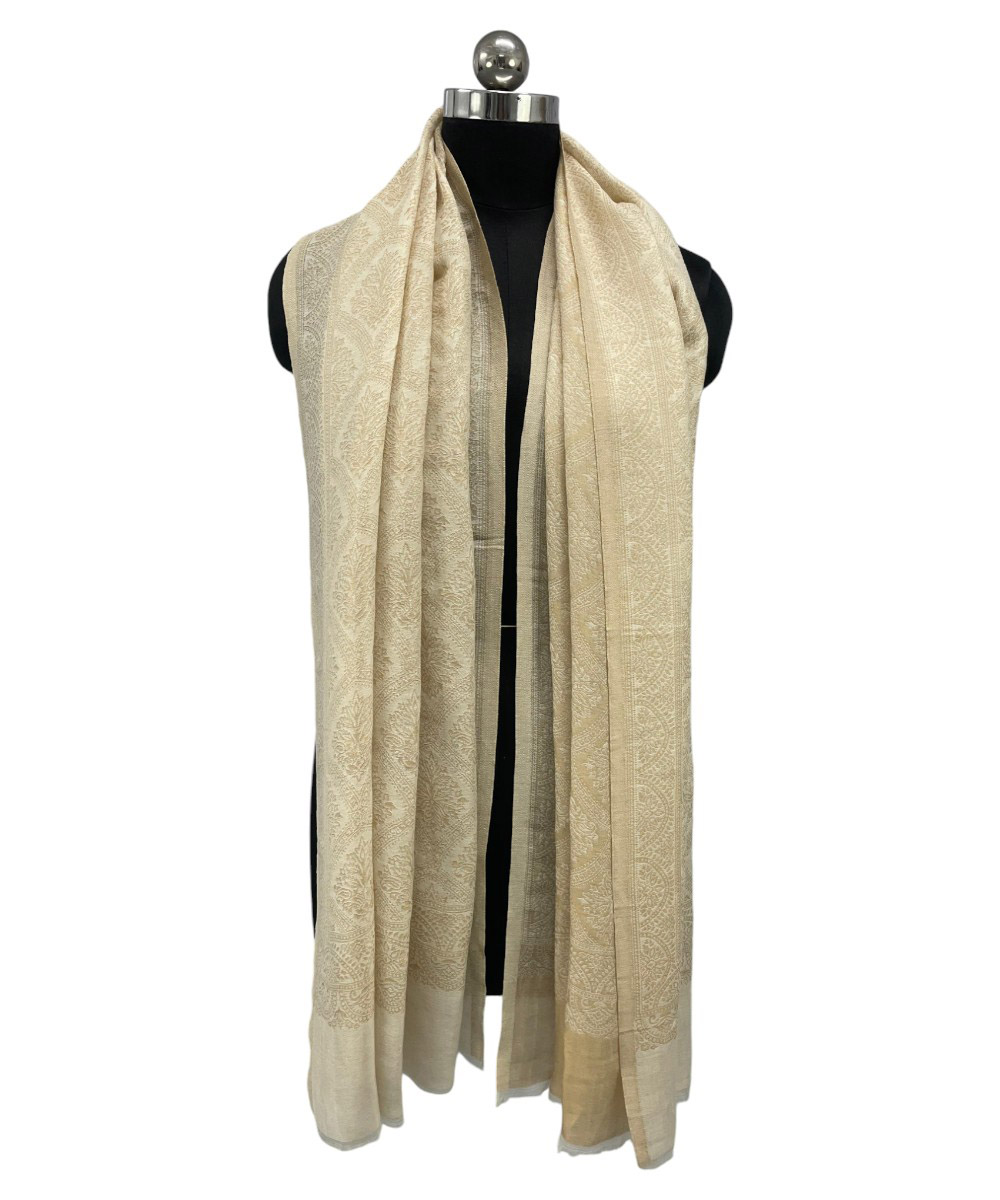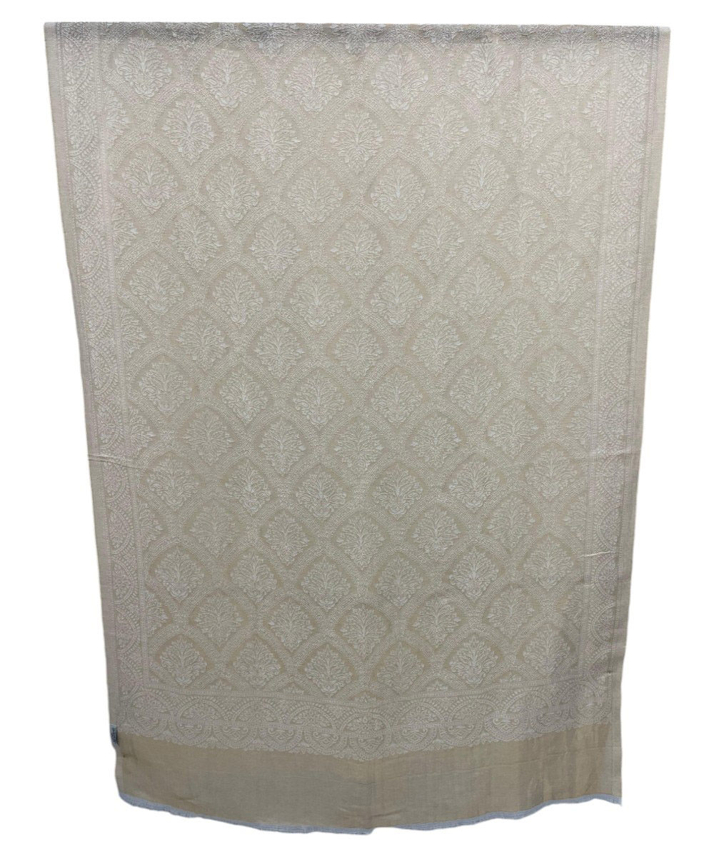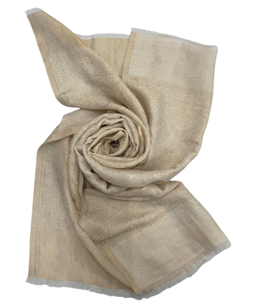 Embrace timeless grace with the Albasir Zari Reversible Stole, beautifully crafted in a versatile white tone with a hint of golden charm. Woven from the finest quality handloom Pashmina fabric, this luxurious stole features intricate zari work combined with elegant Jamawar patterns in a reversible design, offering two exquisite looks in one. The soft, warm texture makes it perfect for cooler seasons, while its refined detailing ensures it stands out at festive gatherings, formal events, or everyday wear. Whether paired with traditional attire or modern ensembles, this stole adds an effortless layer of elegance and sophistication. The Albasir white and gold Zari stole is the perfect finishing touch for those who appreciate heritage craftsmanship and timeless style.