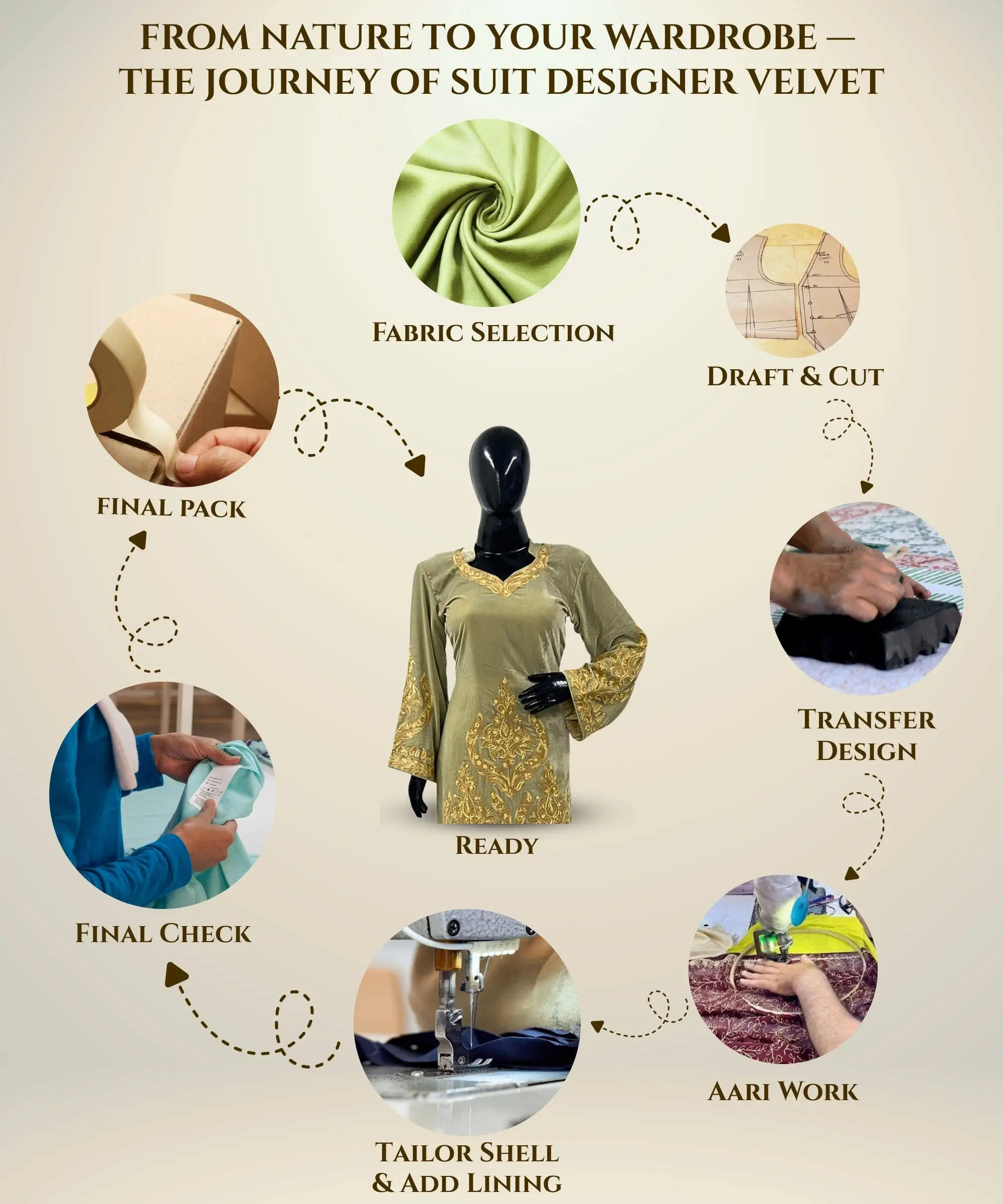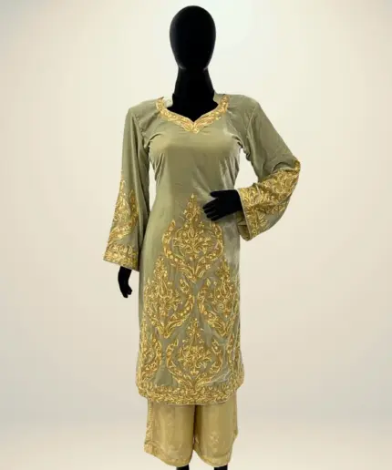 Step into elegance with this designer suit crafted in soft green velvet, offering a luxurious feel and timeless appeal. The ensemble is beautifully detailed with intricate Aari work, adding a refined and graceful finish that elevates the overall look. This two-piece set, thoughtfully designed by our master artisans, includes a 2.5-meter top and a 3-meter dupatta, ensuring a stylish and flattering silhouette. Perfect for festive occasions or special events, this stunning suit set is sure to make you stand out with its rich texture and elegant charm.