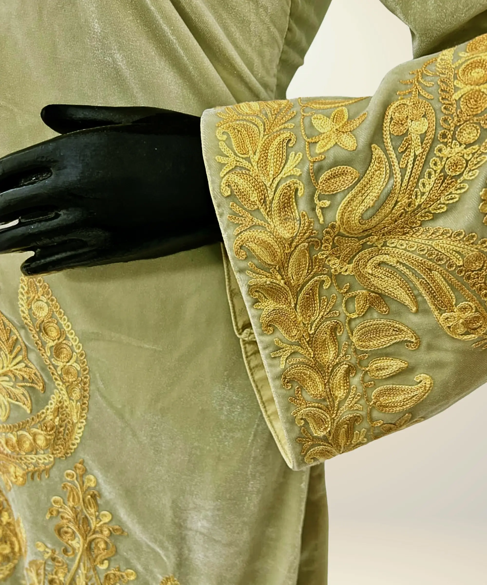 • Elegant Designer Suit Crafted In Soft Green Velvet.