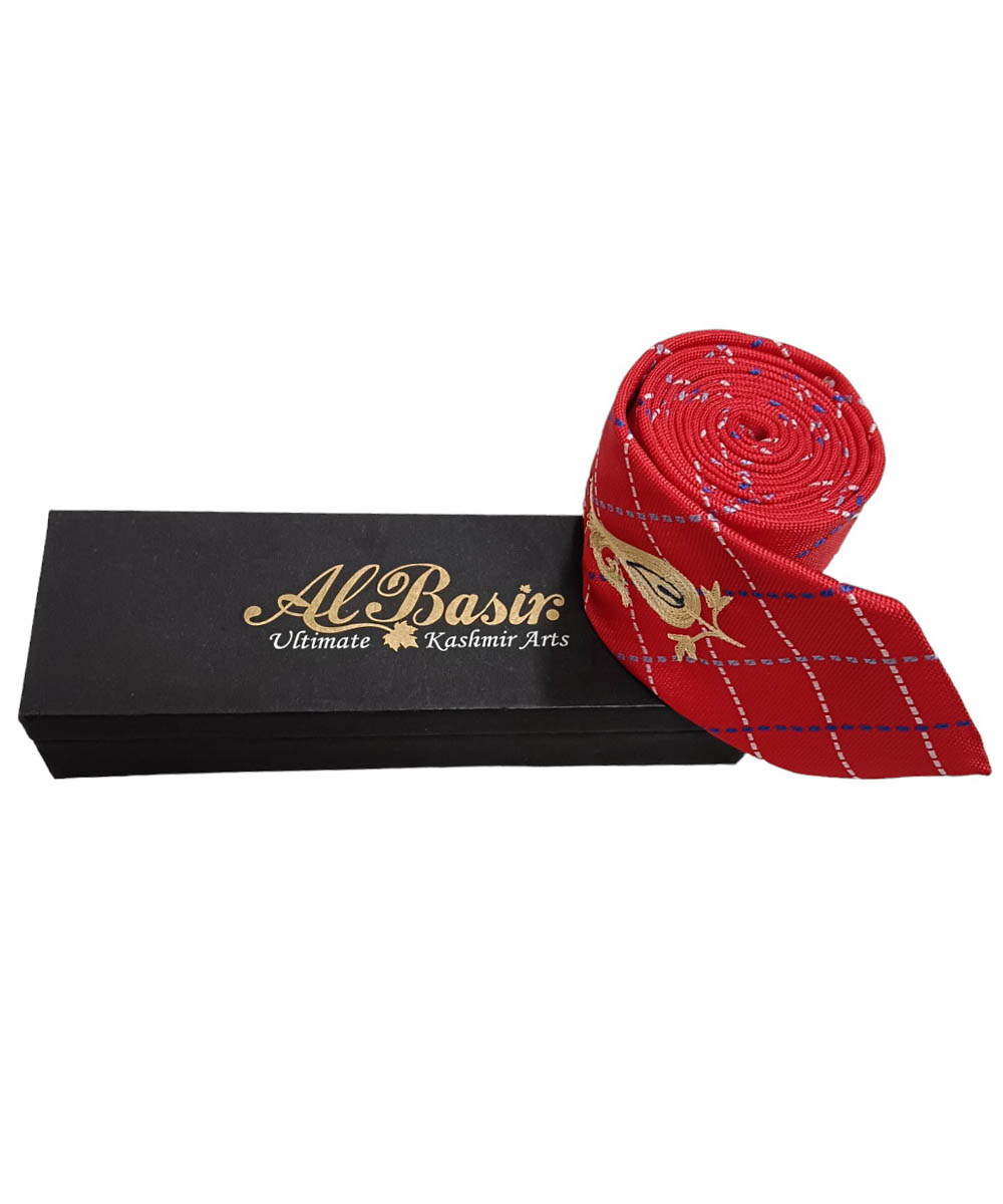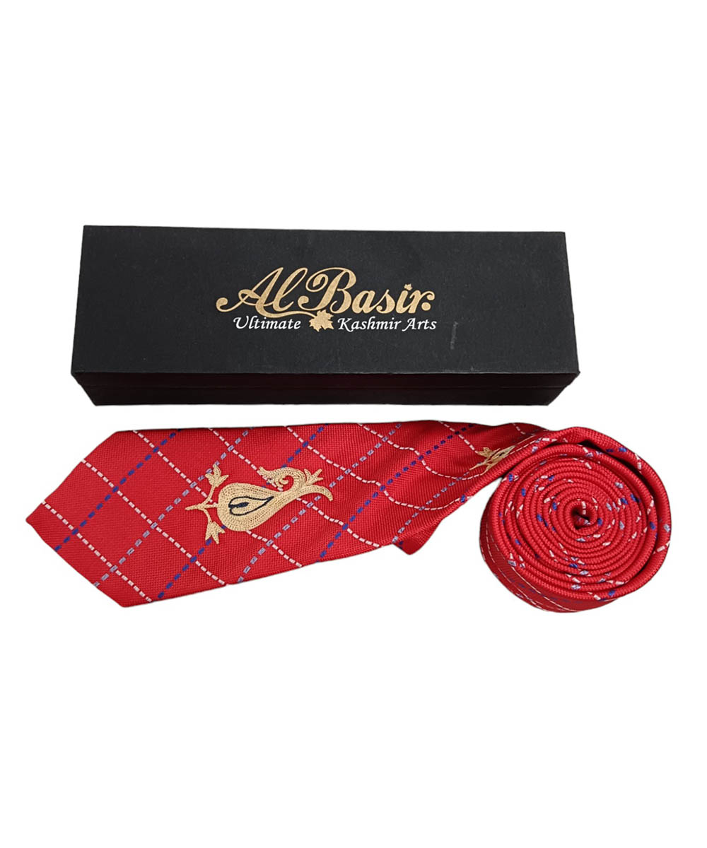 Albasir’s Elegant Red Silk Tie is a statement piece that blends luxury with heritage. Crafted from high-quality silk, it offers a smooth, lustrous finish that adds a refined touch to any formal ensemble. The tie is beautifully adorned with intricate Kashmiri Aari embroidery, featuring a unique motif design that highlights skilled craftsmanship and cultural artistry. The rich red color brings a bold and confident flair, while the detailed embroidery elevates its overall appearance with elegance and depth. Ideal for weddings, business events, or festive occasions, this tie complements both traditional and modern outfits. A perfect accessory for the modern gentleman, it adds sophistication, style, and a touch of timeless charm to any look.