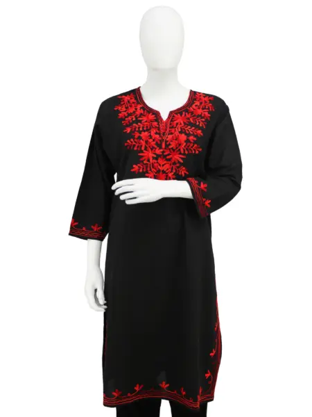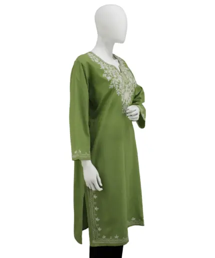This designer tunic in a rich green shade is perfect for effortlessly elevating any style. It is exquisitely embroidered with authentic Aari work, showcasing fine craftsmanship and intricate detailing. Combining comfort with a unique and stylish design, this tunic offers a refined and standard look that stands out. Ideal for summer wear, it allows you to flaunt a trendy and fashionable vibe while staying comfortable and chic all day long.