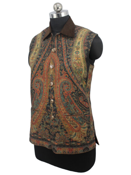 This authentic multi-color unisex waistcoat exudes a classic and timeless look, perfect for those who appreciate traditional elegance with a vibrant touch. Featuring intricate hand needlework in a Jamawar design, it reflects rich artistic charm and skilled craftsmanship. The waistcoat is thoughtfully designed with three delicate yet convenient pockets and a stylish mandarin collar, adding both functionality and sophistication. Crafted from premium quality handmade Pashmina, this piece offers luxurious comfort and warmth, making it an ideal choice for festive wear and special occasions.