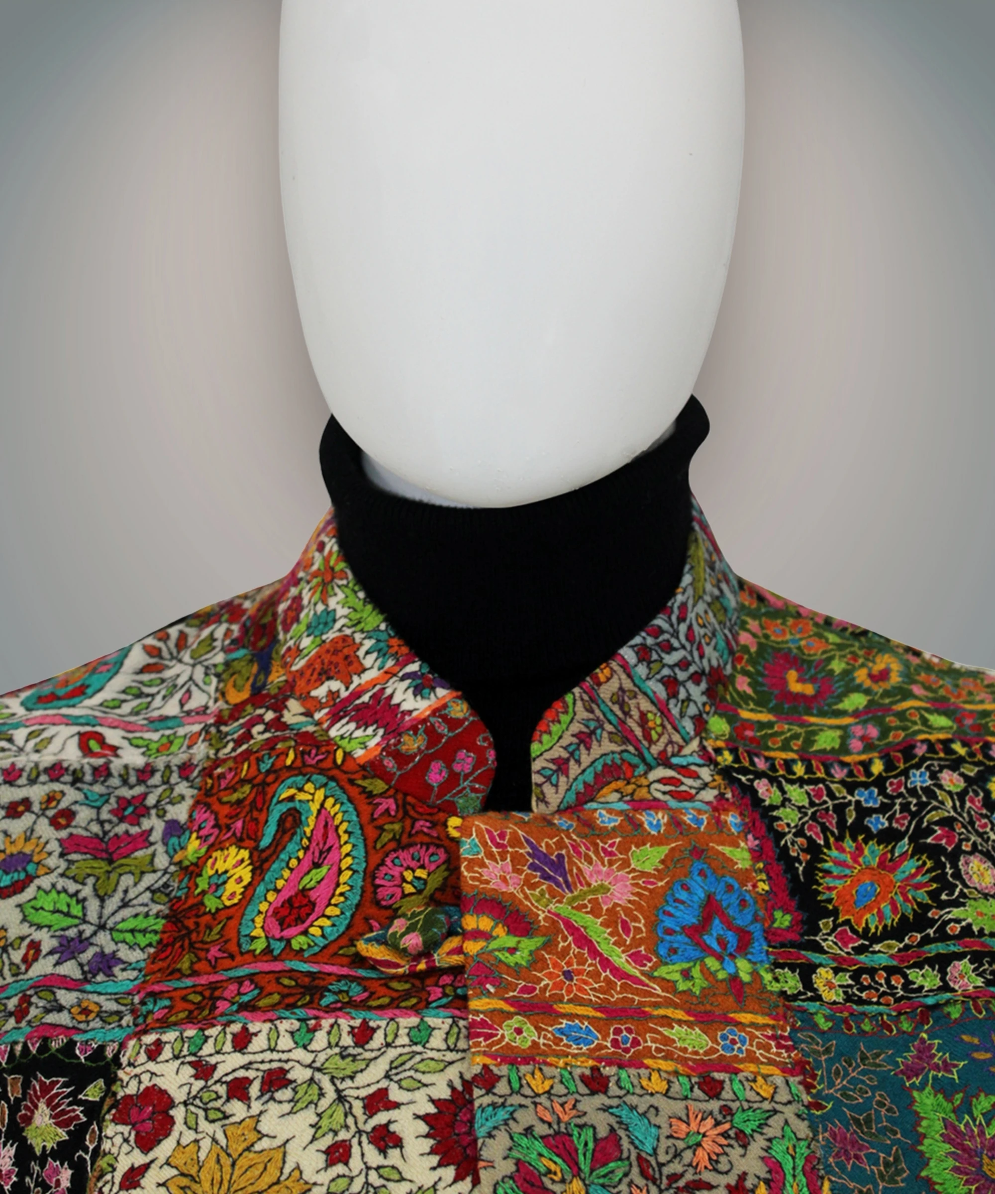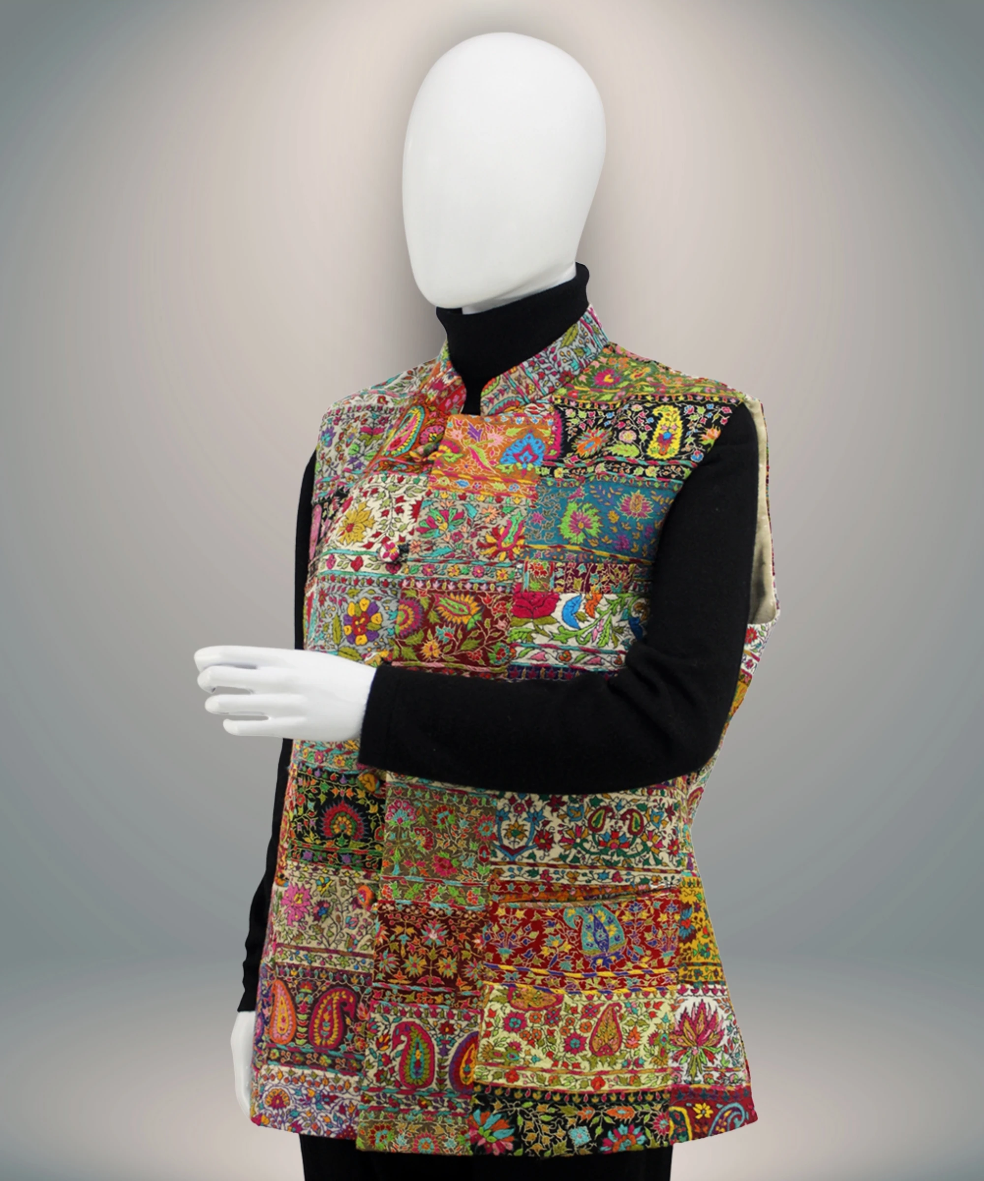 This handmade unisex waistcoat features a vibrant multi-colour palette that adds a lively and distinctive touch to any outfit. Adorned with intricate hand needlework in a traditional Jamawar design, it showcases detailed craftsmanship that reflects a rich cultural heritage. Designed with practicality in mind, the waistcoat includes three convenient pockets and is finished with a stylish mandarin collar for a modern, sophisticated look. Crafted from the finest quality handmade Pashmina, this waistcoat offers exceptional softness, warmth, and durability, making it a luxurious and versatile addition to any wardrobe.