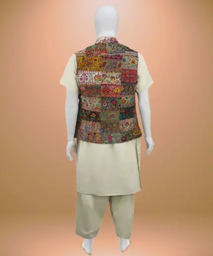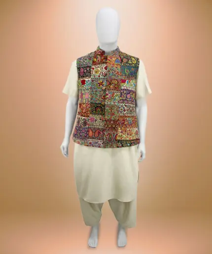 This handcrafted unisex waistcoat features a bold and colorful pattern that makes a striking statement while celebrating traditional artistry. Adorned with intricate hand needlework in a classic Jamawar design, it showcases fine detailing that reflects skilled craftsmanship and cultural richness. The design is thoughtfully completed with three convenient pockets and a stylish mandarin collar, blending practicality with refined elegance. Crafted from the finest quality of handmade Pashmina, this waistcoat offers exceptional warmth, softness, and comfort—making it a luxurious and versatile choice for both formal occasions and everyday sophistication.