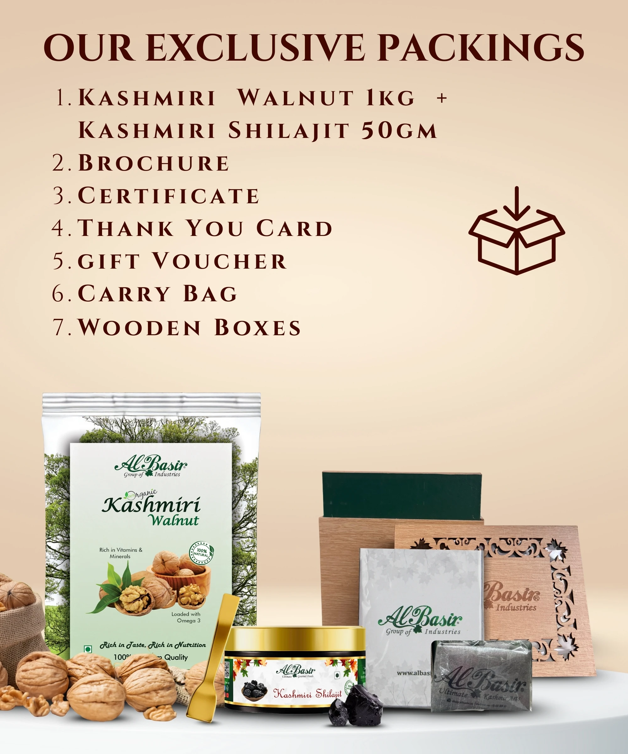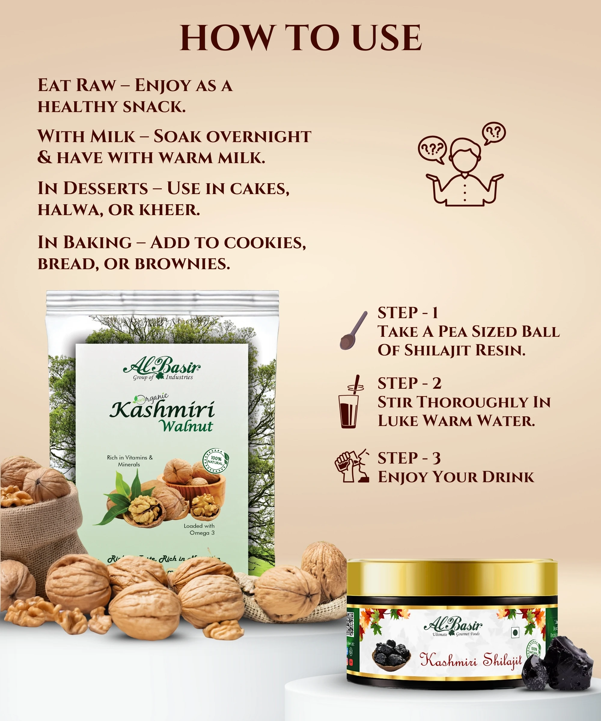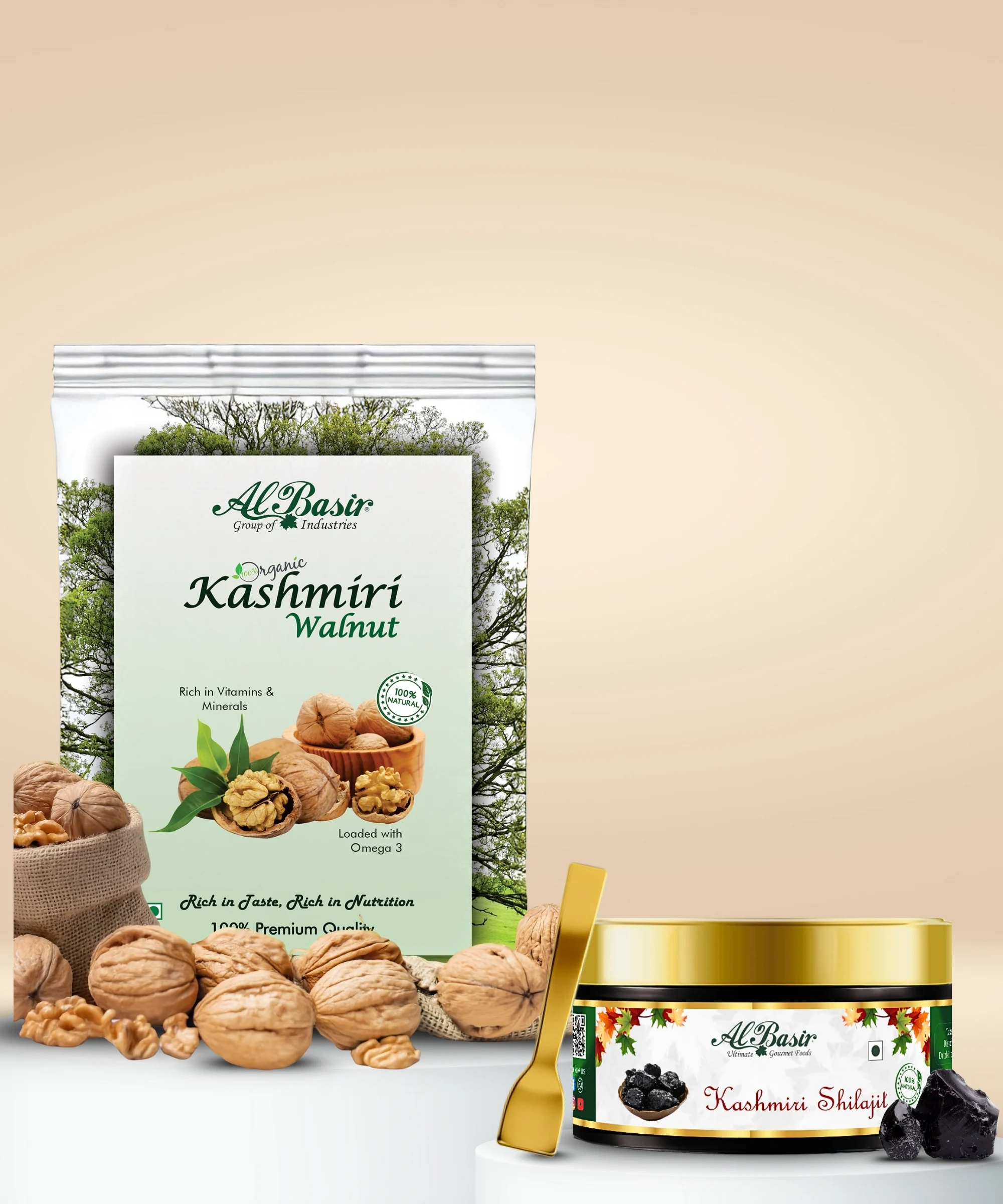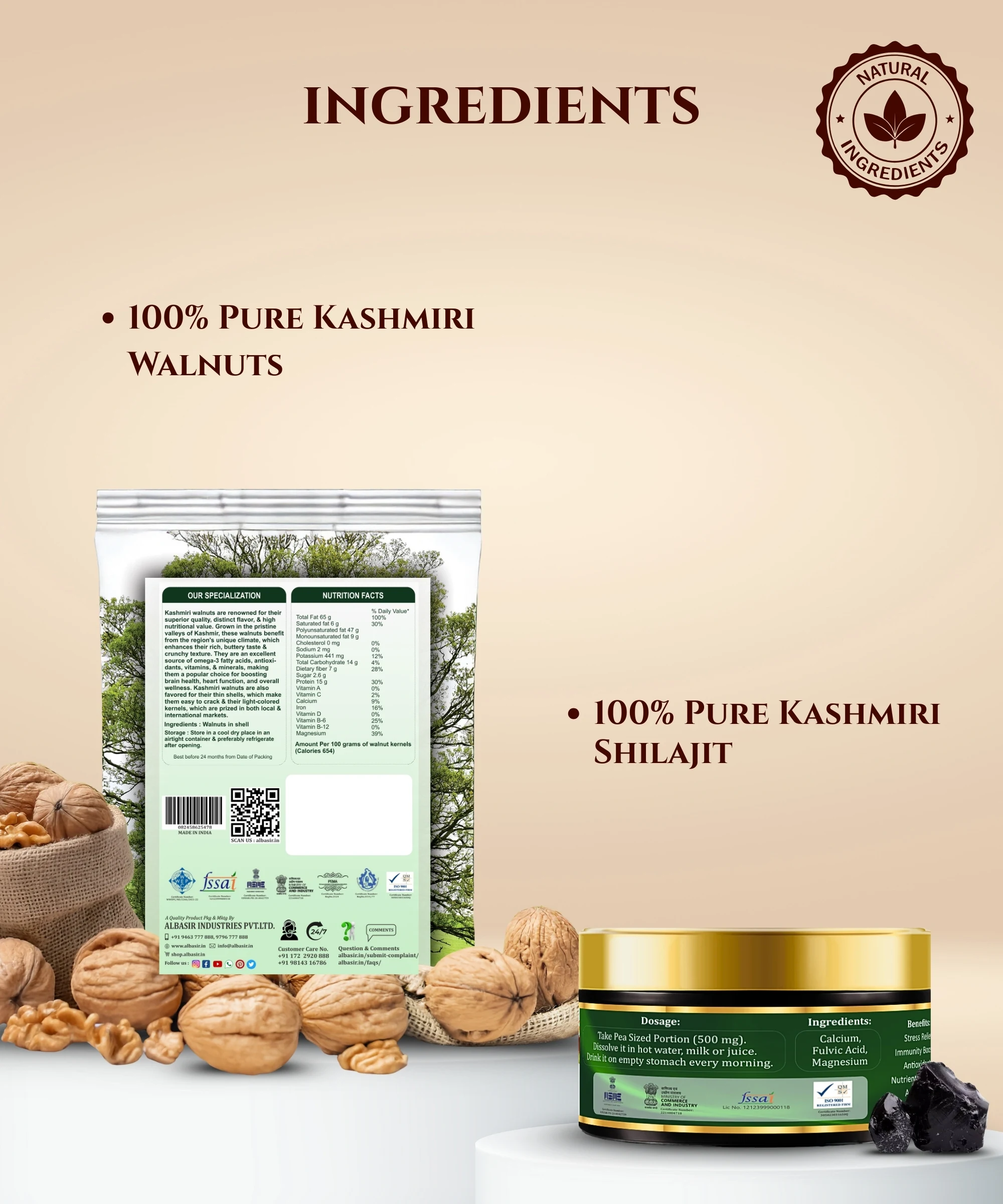 The Albasir Kashmiri Shilajit + Walnut Kernel Combo is a fusion of ancient Ayurvedic wisdom and Himalayan nutrition — thoughtfully blended for modern wellness.